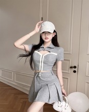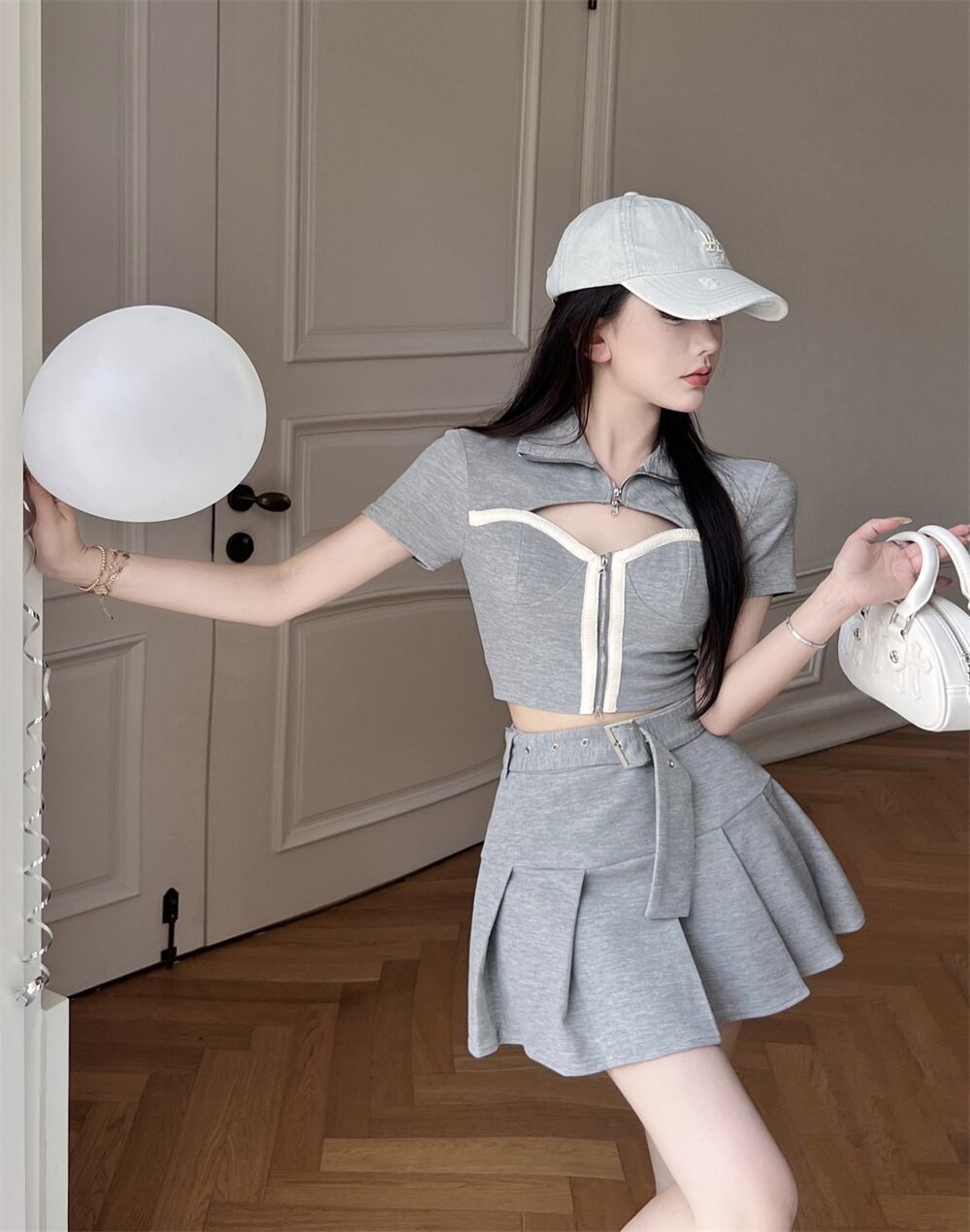 ホットガールズスーツの中空半袖 Tシャツトップウエスト A ラインプリーツスカート 2 点セット服 Aライン