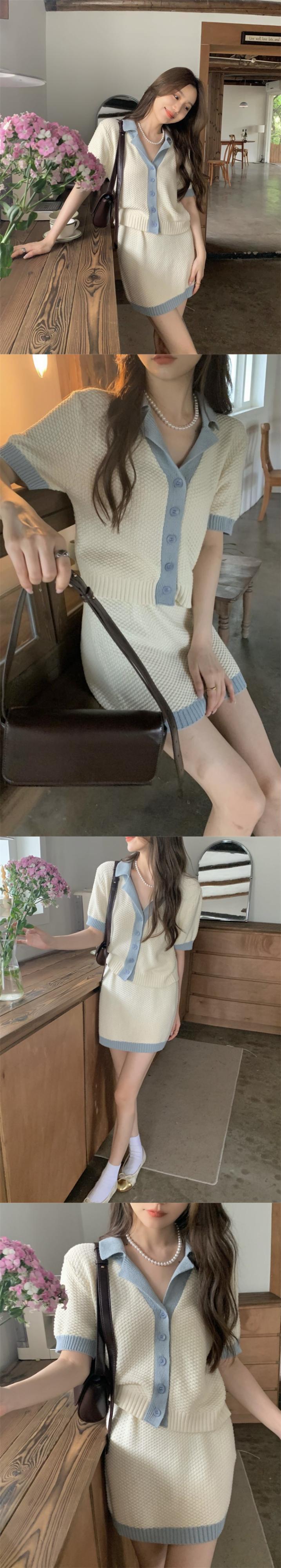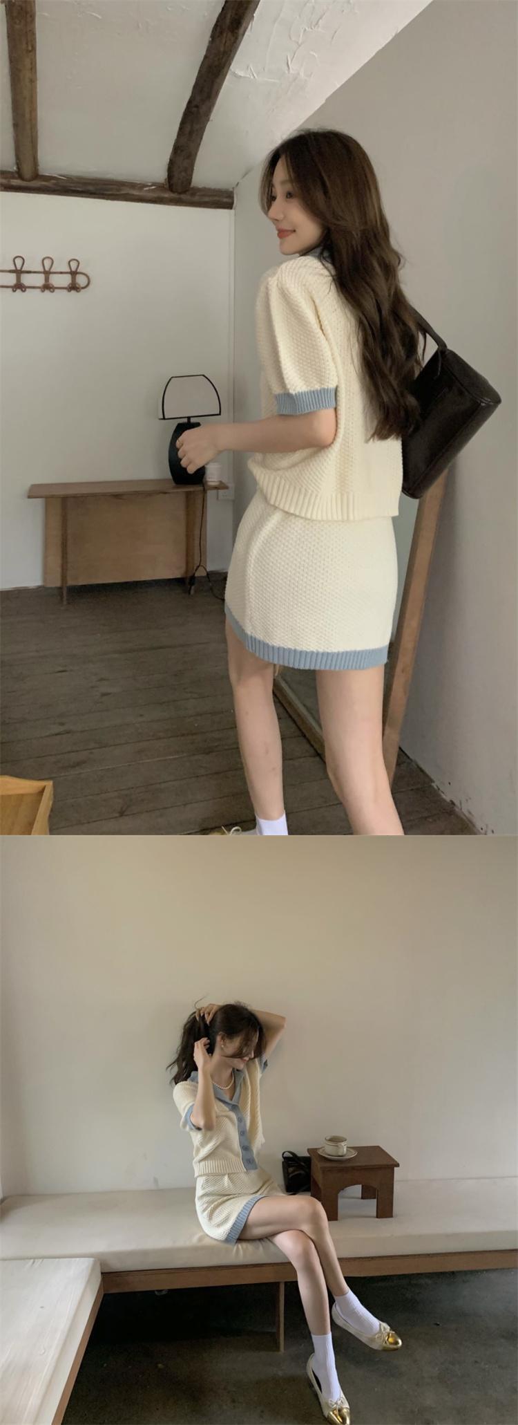OLスーツ レディース コントラスト ターンダウンカラー 半袖 ニット カーディガン ウエスト お尻スカート 2点セット 会社 学校 通勤や通学にも