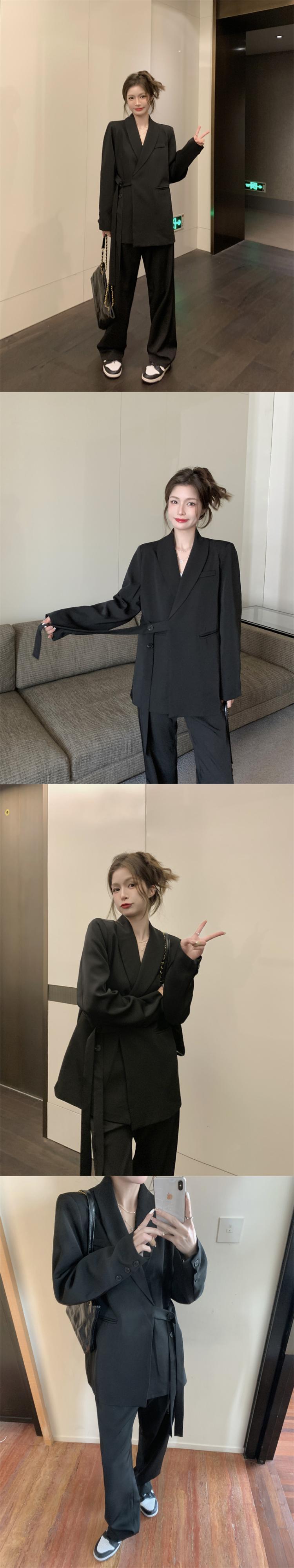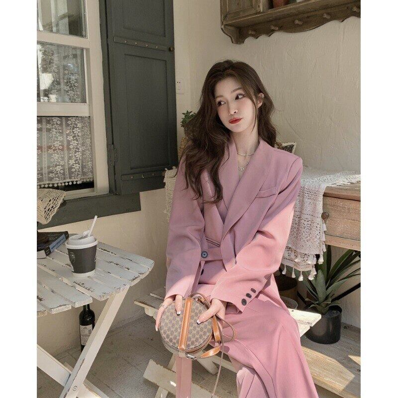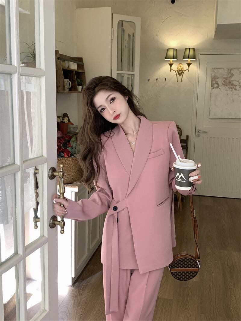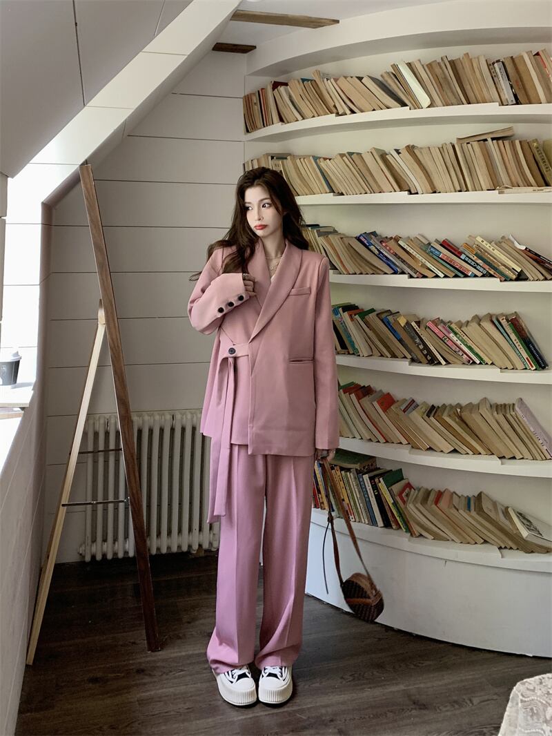 オフィスレディ 通勤 ピンク スーツ レディース 春 長袖 コート ルーズパンツ 2点セット 洋服 ロング スプリング 春物 会社 学校 通勤や通学にも