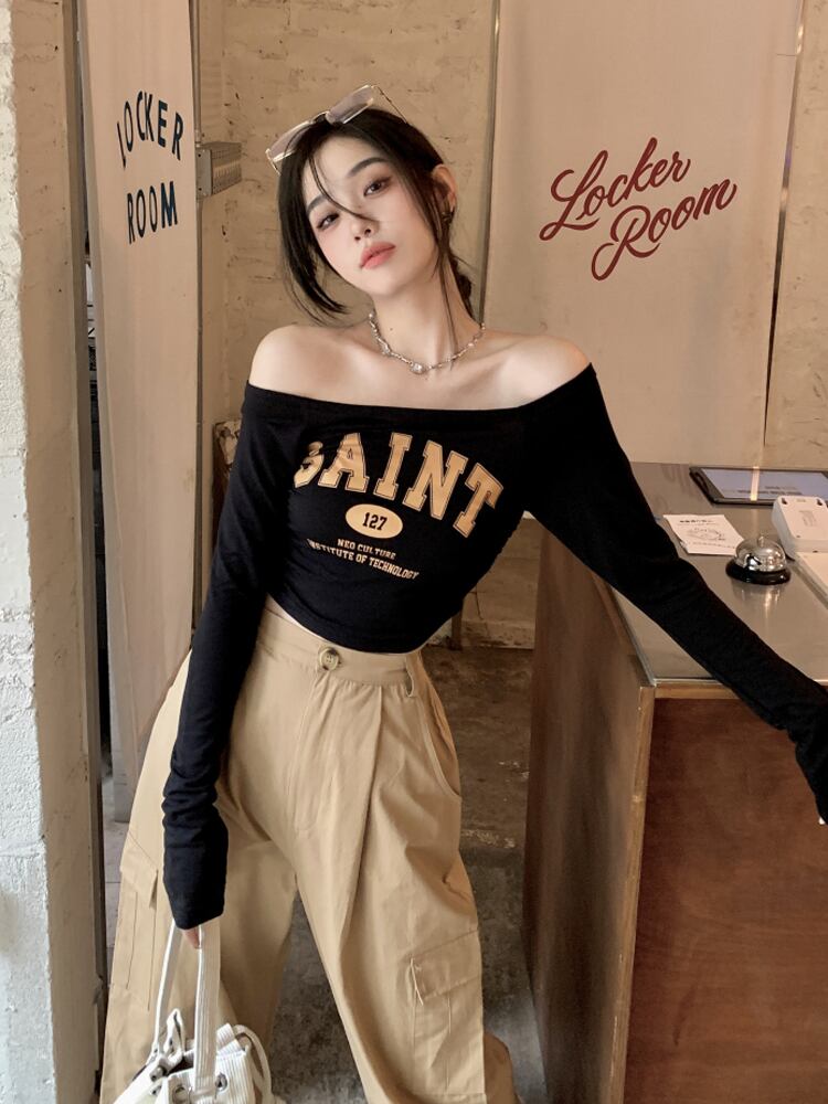 レディースツーピースセットレタープリントスラッシュネックショートTシャツオーバーオールロングカーゴパンツプレッピースタイル秋セット オータム 秋物