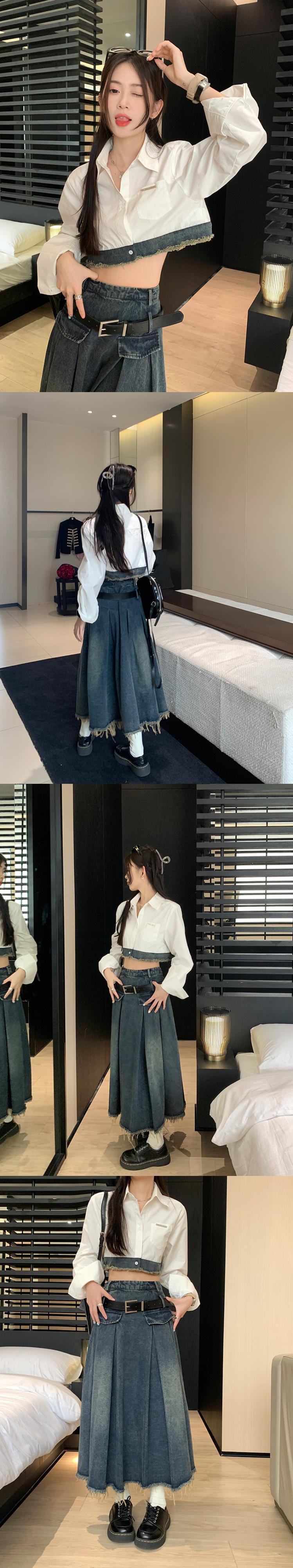 スプライス ホット ガールズ スーツの生裾付き長袖シャツの春ウエスト テル デニム ロング スカート 2 点セット スプリング 春物
