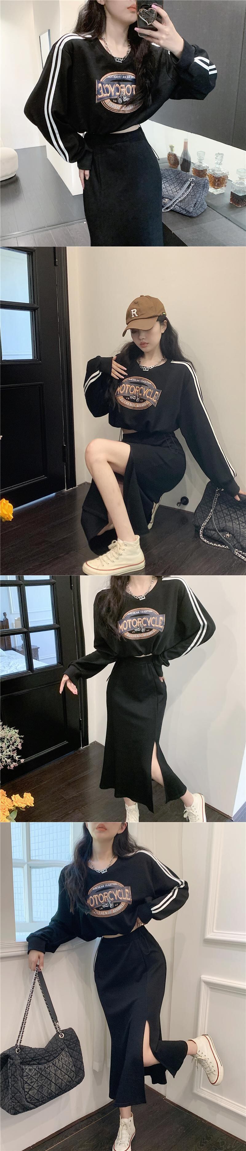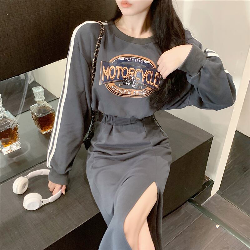 ツーピースセットレディース衣装ウエストスプリットスカート長袖トップス梨花服秋/冬のスカートセット ロング オータム 秋物 ウィンター 冬物 ソリッドカラー