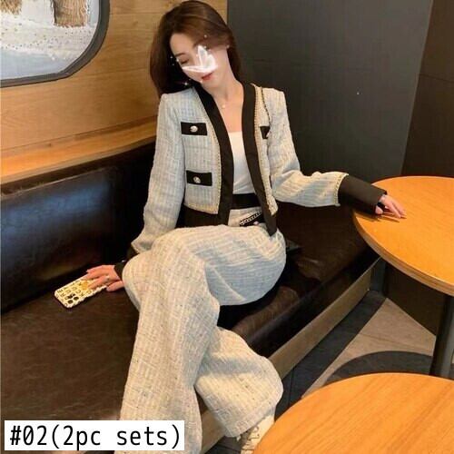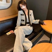 レディースツーピースセットスモールフレグランスチェック柄ラグジュアリーVネックトップスワイドレッグパンツプレッピースタイル秋セット オータム 秋物 ワイドパンツ