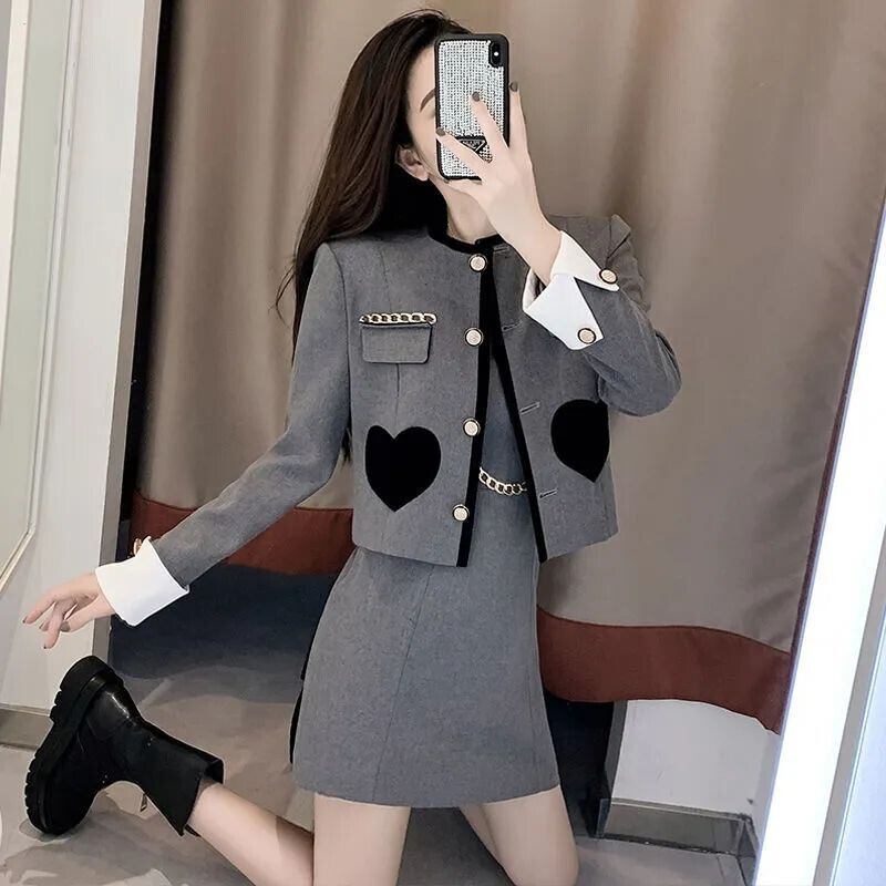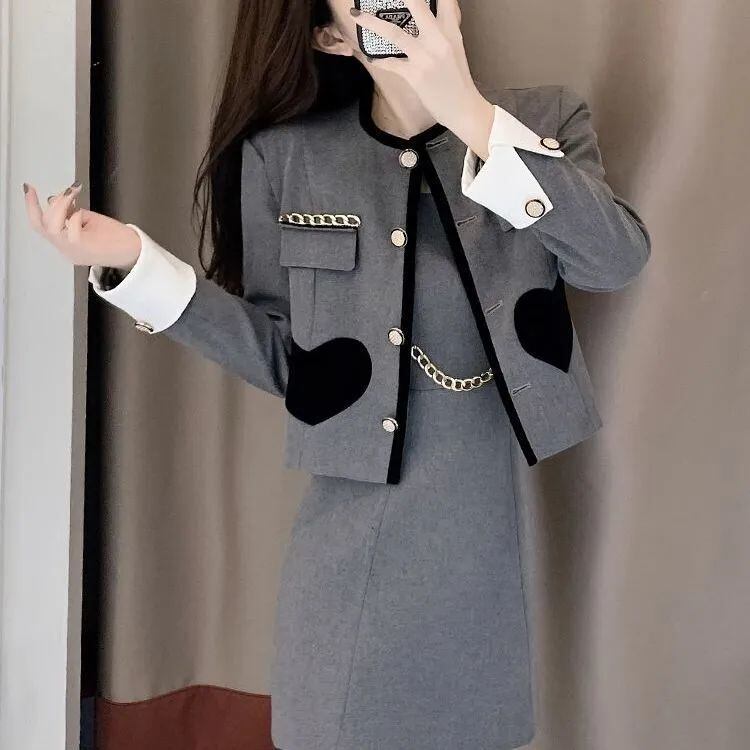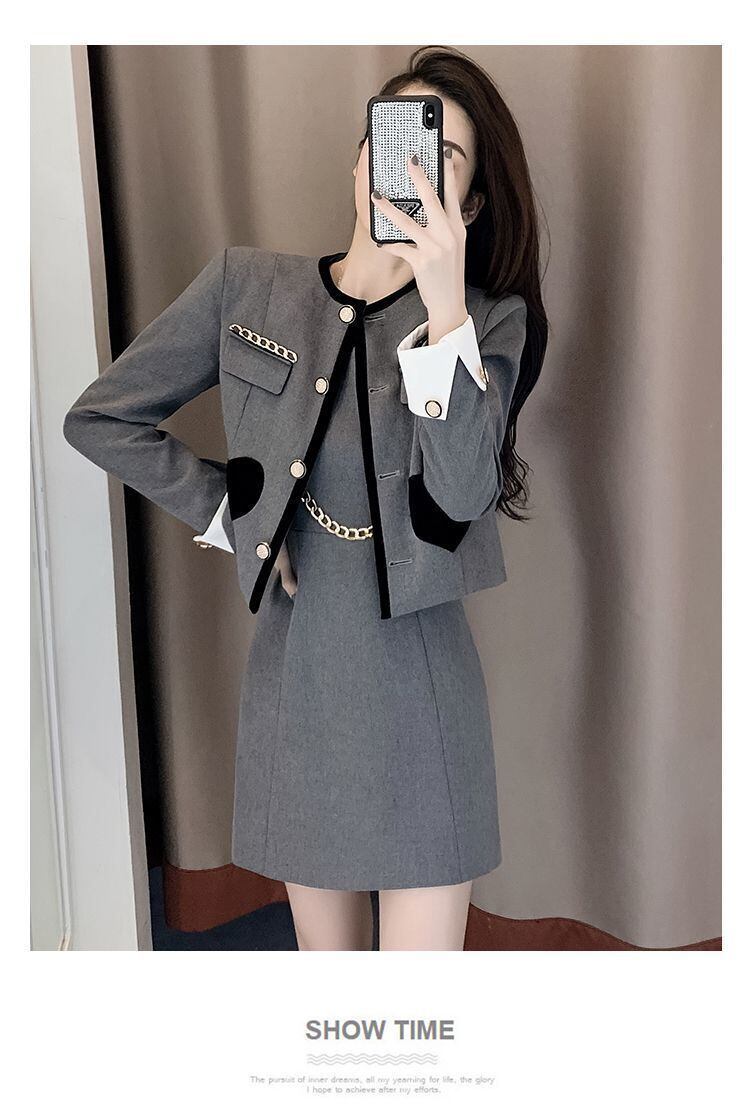 スウィートガール春のスーツののストラップ付きスリムショートドレス長袖ラウンドネックコートツーピースセット服 ロング 大人ガーリー キュート カジュアル スプリング 春物 Oネック