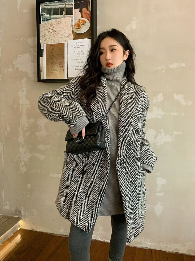 通勤スーツコートジャケット秋冬スタイルルーズヘリンボーンウールコート服 オータム 秋物 ウィンター 冬物