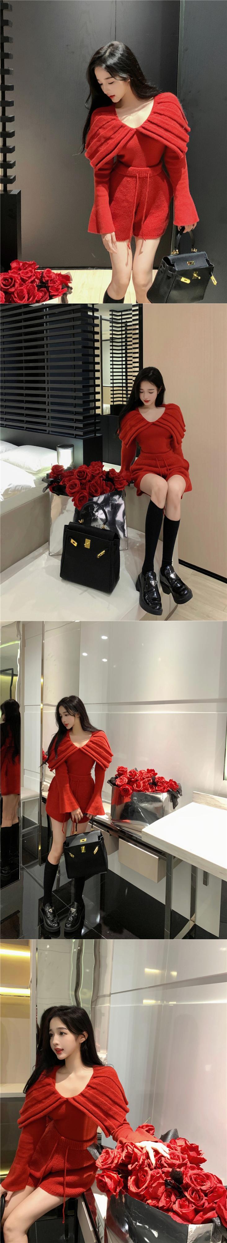 クリスマススーツ年暖かい赤いセーターのの弾性ウエストニットショートパンツ 2 点セット服 レッド エラスティック 伸縮