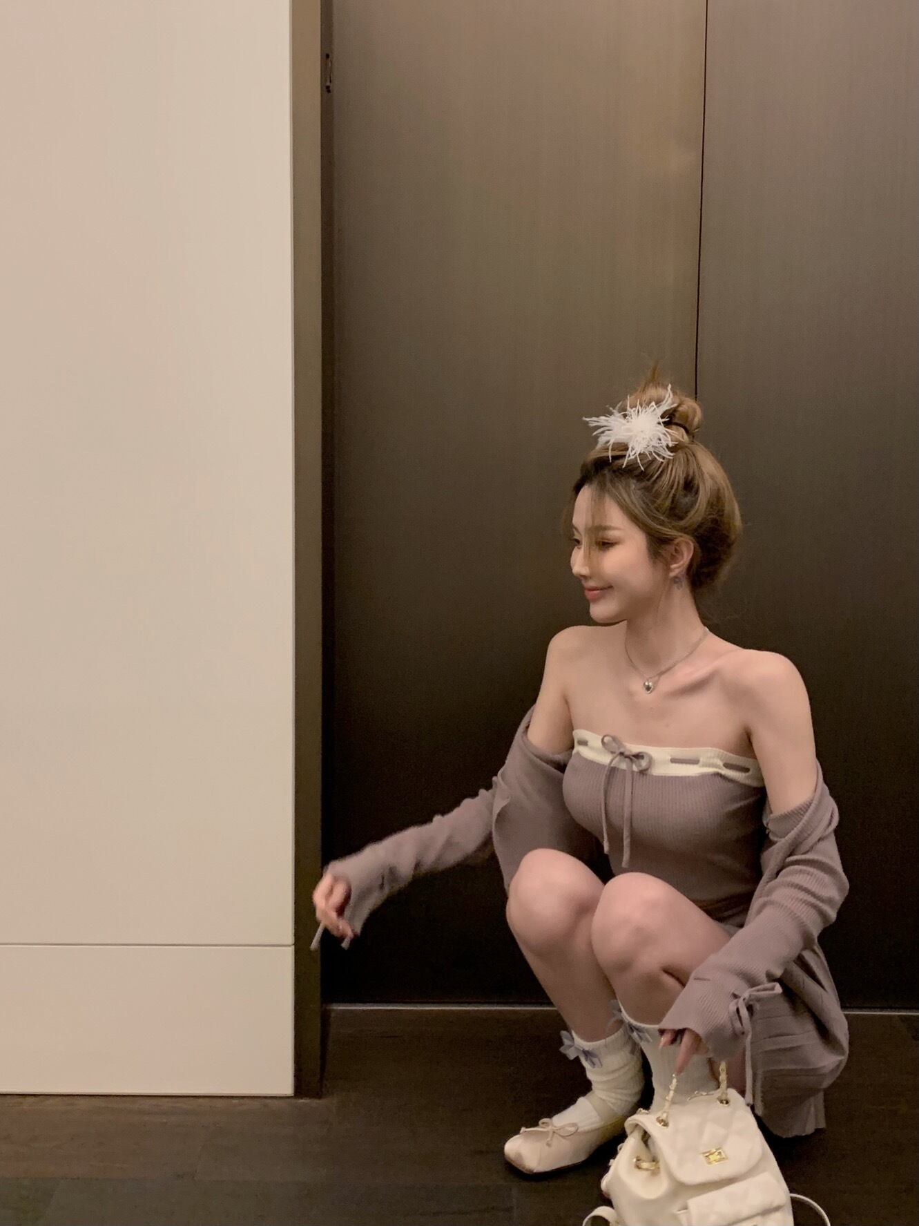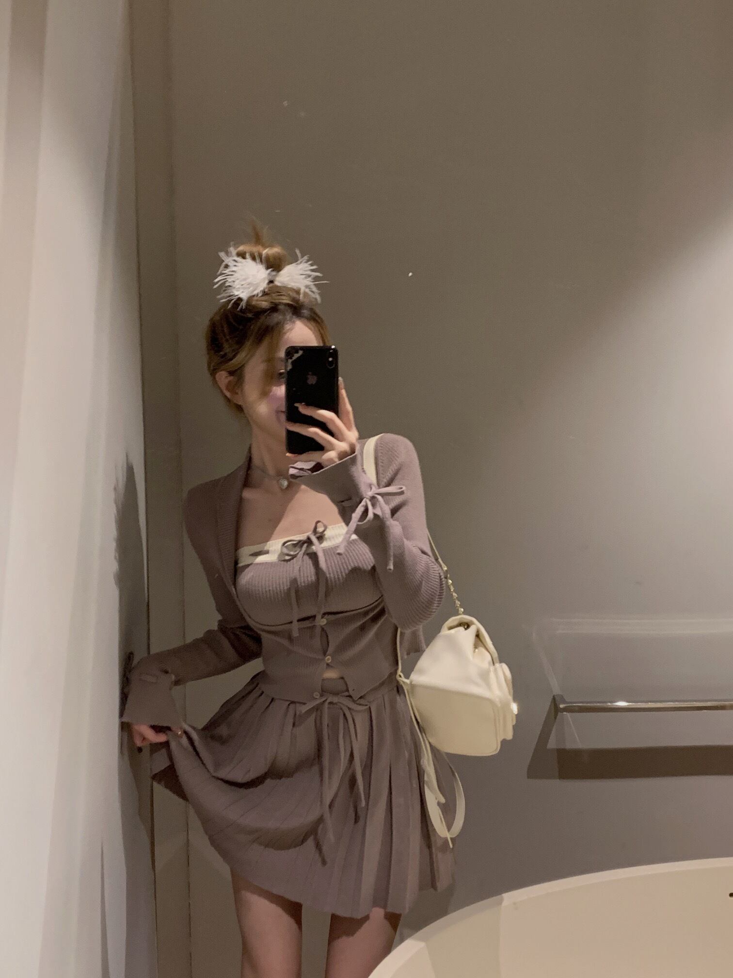 スウィートガールスーツレディース無地ニットカーディガンストラップレストップウエストプリーツスカート3点セット服 大人ガーリー キュート カジュアル ソリッドカラー