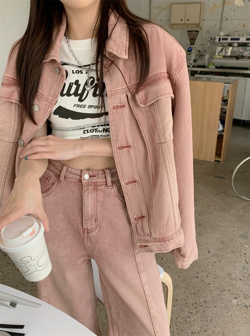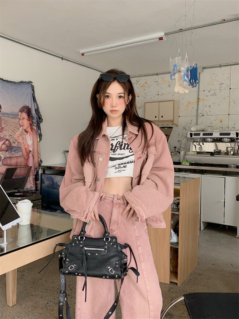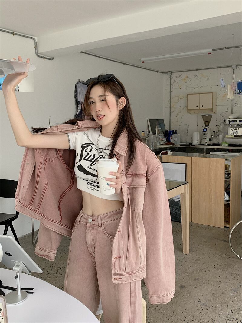 ピンクデニムスーツの春長袖ルーズコートウエストワイドレッグパンツツーピースセット服 ロング スプリング 春物 ワイドパンツ