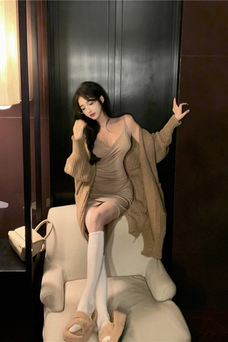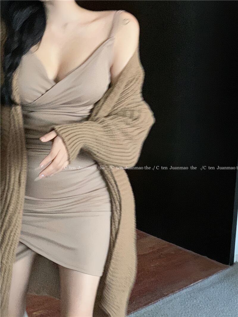 スウィートガールスーツミディアム丈のセーターコートの冬の不規則なサスペンダードレス 2 点セット服 大人ガーリー キュート カジュアル ウィンター 冬物