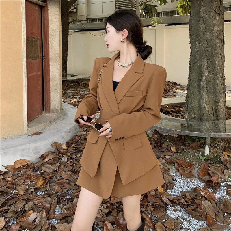 香港式スーツ ミディアム丈 長袖 ワンボタンコート ウエストスカート 2点セット 洋服 ロング