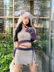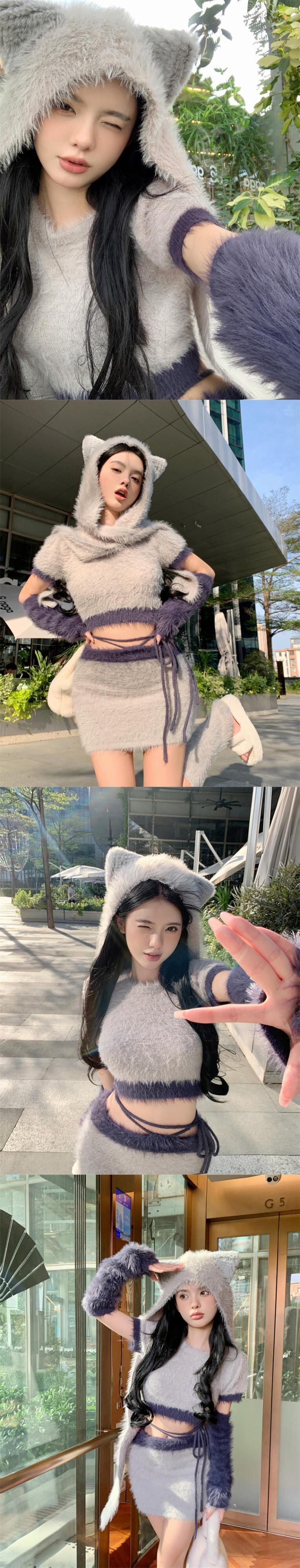 Sweet Hot Girl セット レディース 秋冬 グレー ショート プルオーバー ニット トップス ミニスカート 猫耳帽子 3点セット 大人ガーリー スウィート キュート カジュアル オータム 秋物 ウィンター 冬物