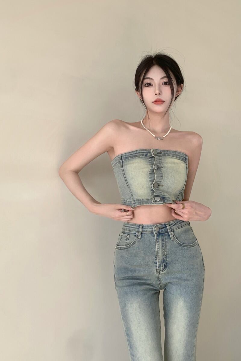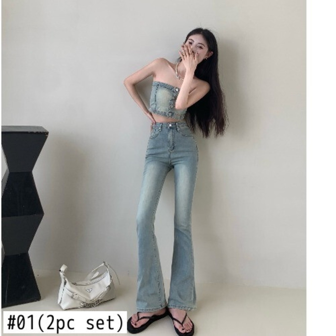 春香港スタイルホットガールスーツのストラップレススリムフィットトップ弾性スリムフレアジーンズツーピースセット レッド エラスティック 伸縮 スプリング 春物