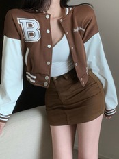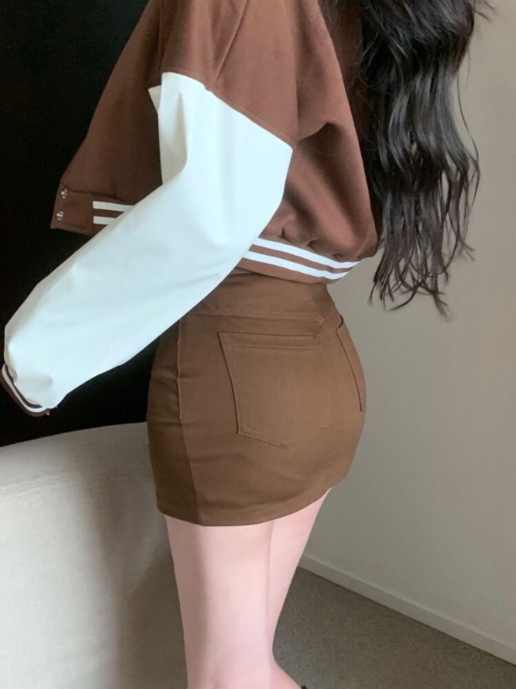 Gothiscyn アメリカのレトロな野球ジャケット クロップ トップ + スカート スキニー 2 ピーススーツ ブラウン春パーティー シックなストリート スプリング 春物