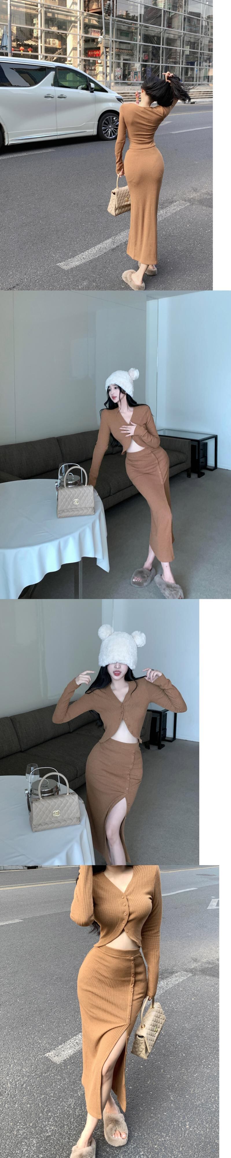 ホットガールスーツセクシーな V ネックカーディガンの秋と冬の中丈スプリットラップヒップスカート 2 点セット服 オータム 秋物 ウィンター 冬物 Vネック
