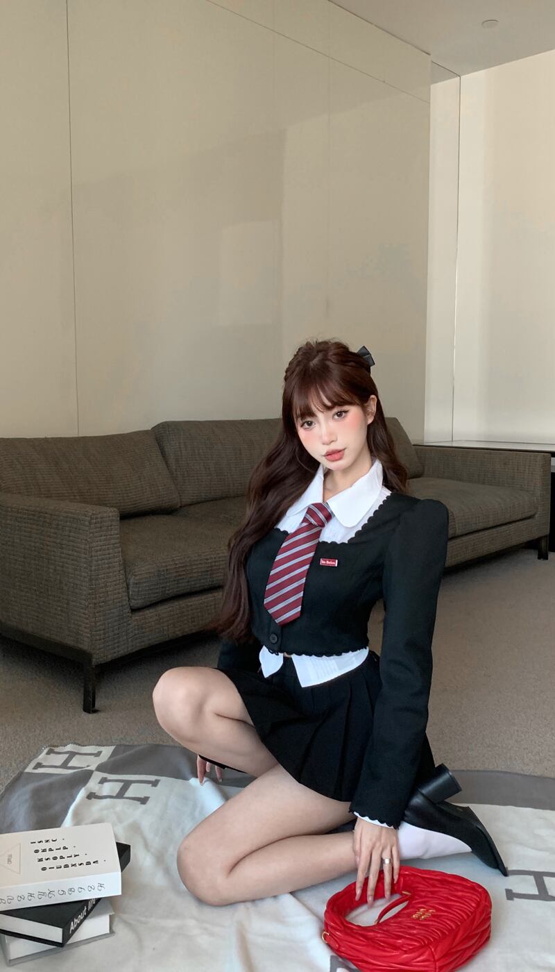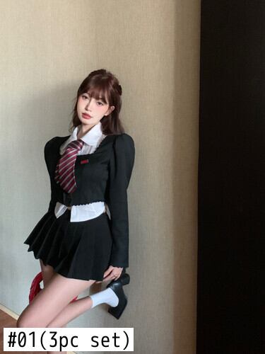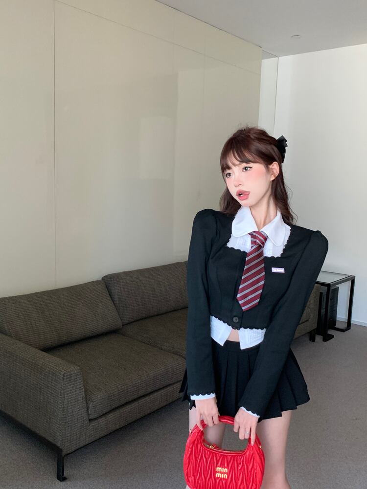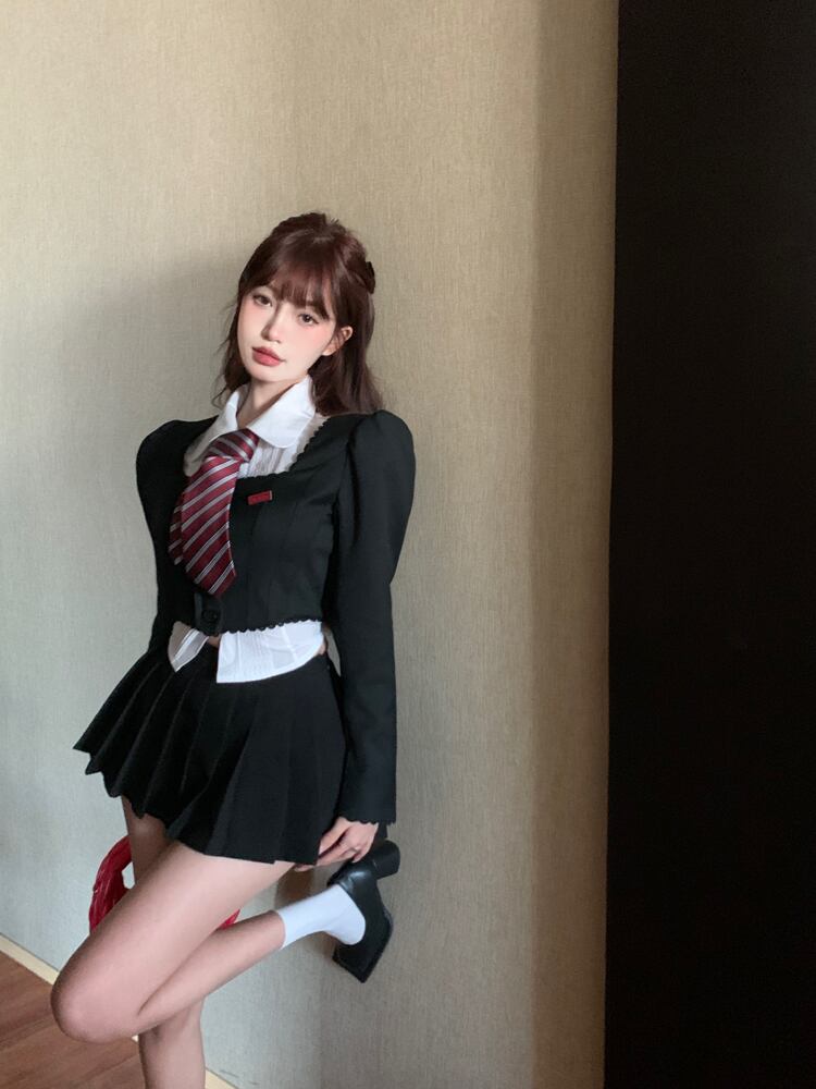 プレッピースタイル スーツ 秋冬 長袖 スクエアカラー コート 白シャツ ネクタイ付き プリーツスカート スリム 3点セット ロング ホワイト オータム 秋物 ウィンター 冬物 スクウェア