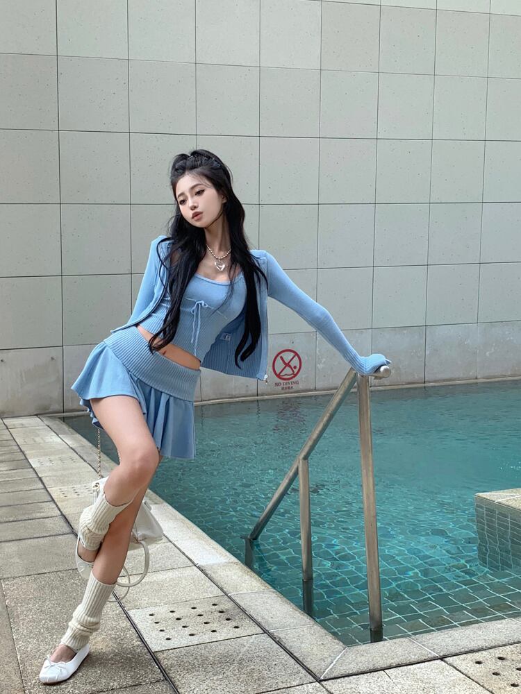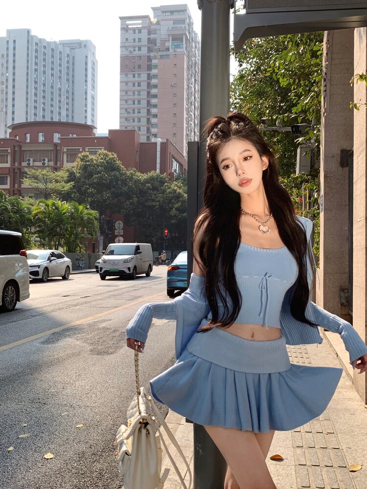 アメリカン ホット ガール スーツのスリム キャミソール ウエスト スカート長袖カーディガン ブルー ニット 3 点セット服 ロング