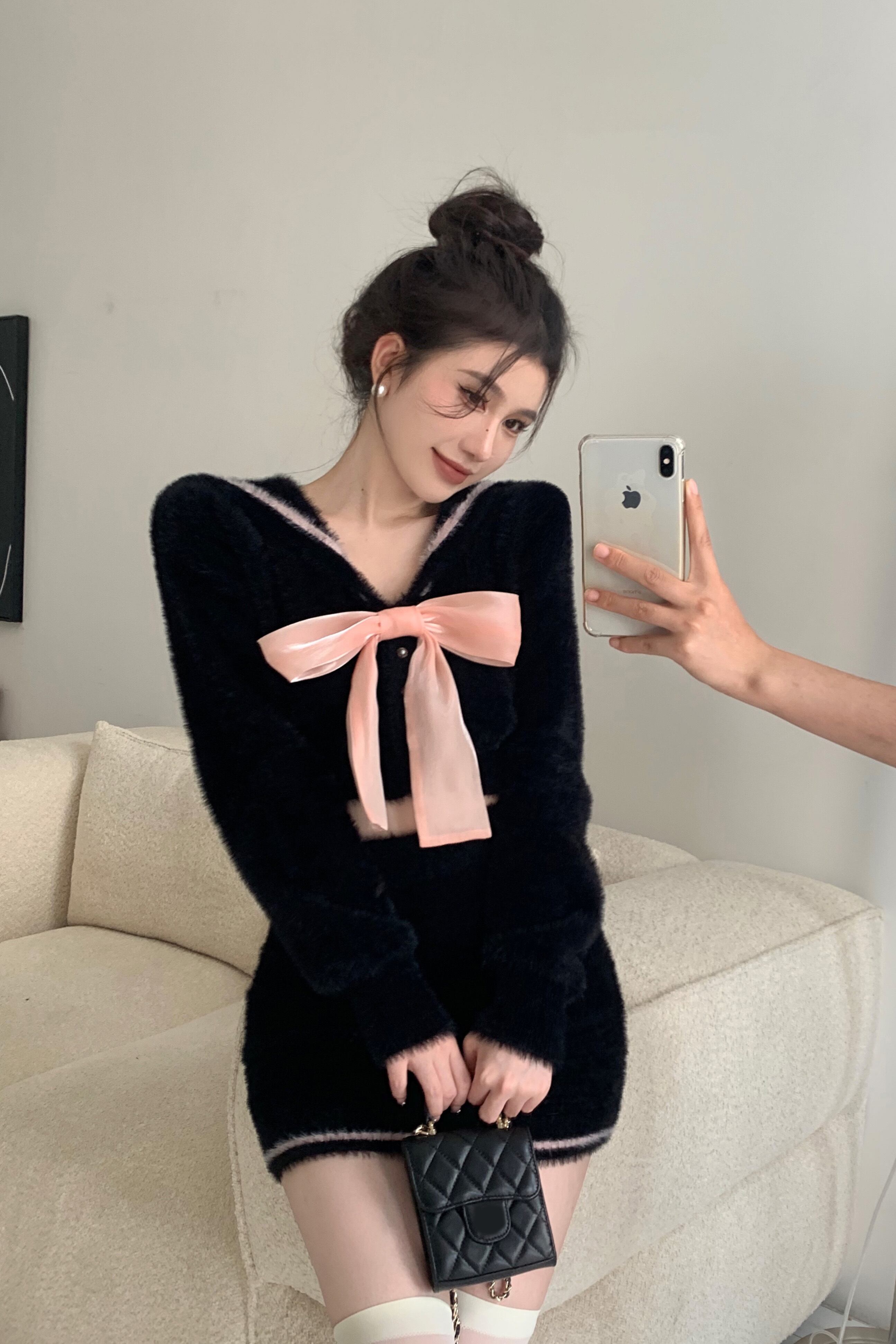 ホットガールスーツちょう結び V ネック長袖ショートトップウエストヒップラップスカート 2 点セット服 ロング リボン Vネック