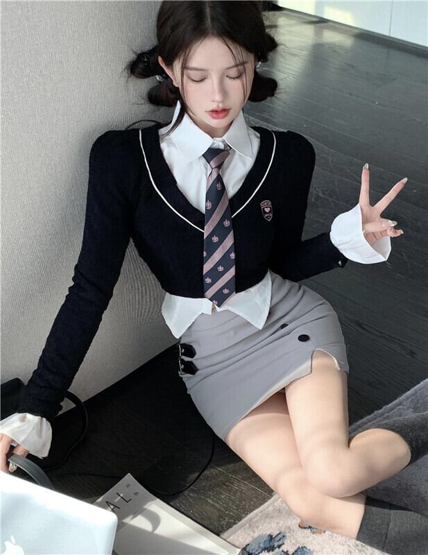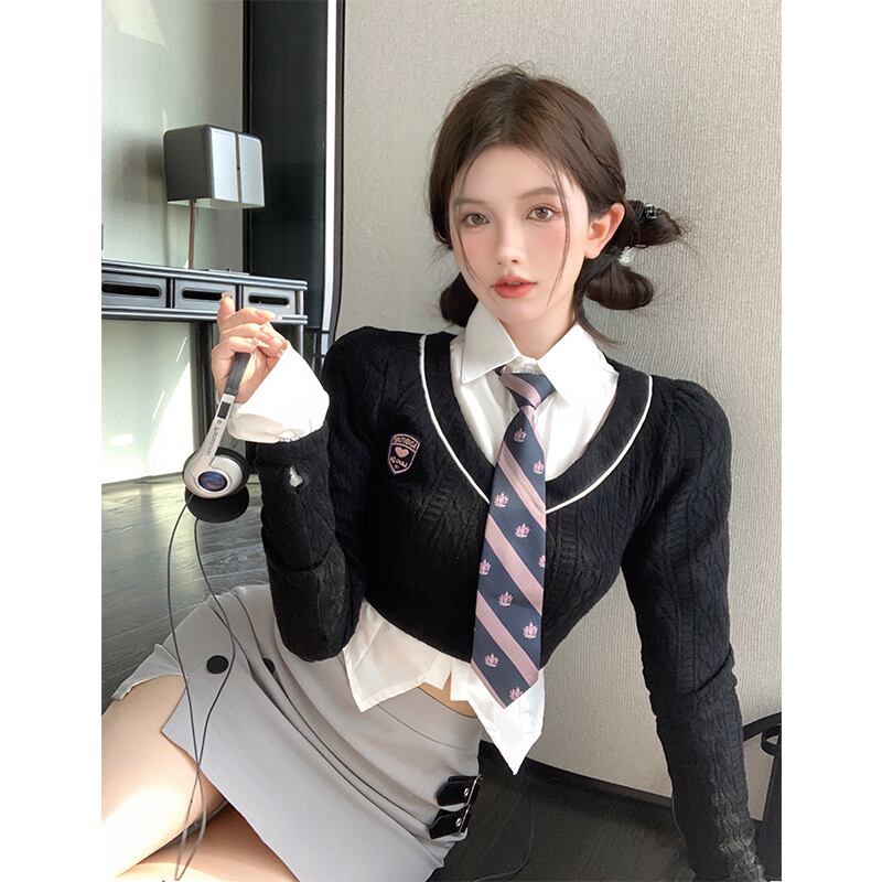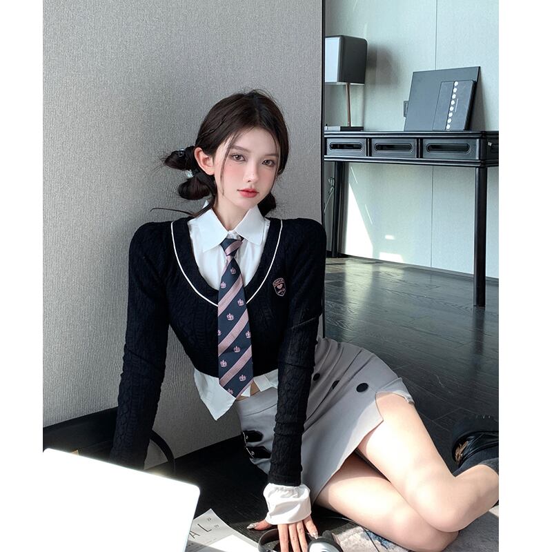 Gothiscyn 3 点セット レディース衣装黒ニット V ネック トップ スパイス ガール スカート服秋のプレッピー スカート セット ブラック オータム 秋物 Vネック