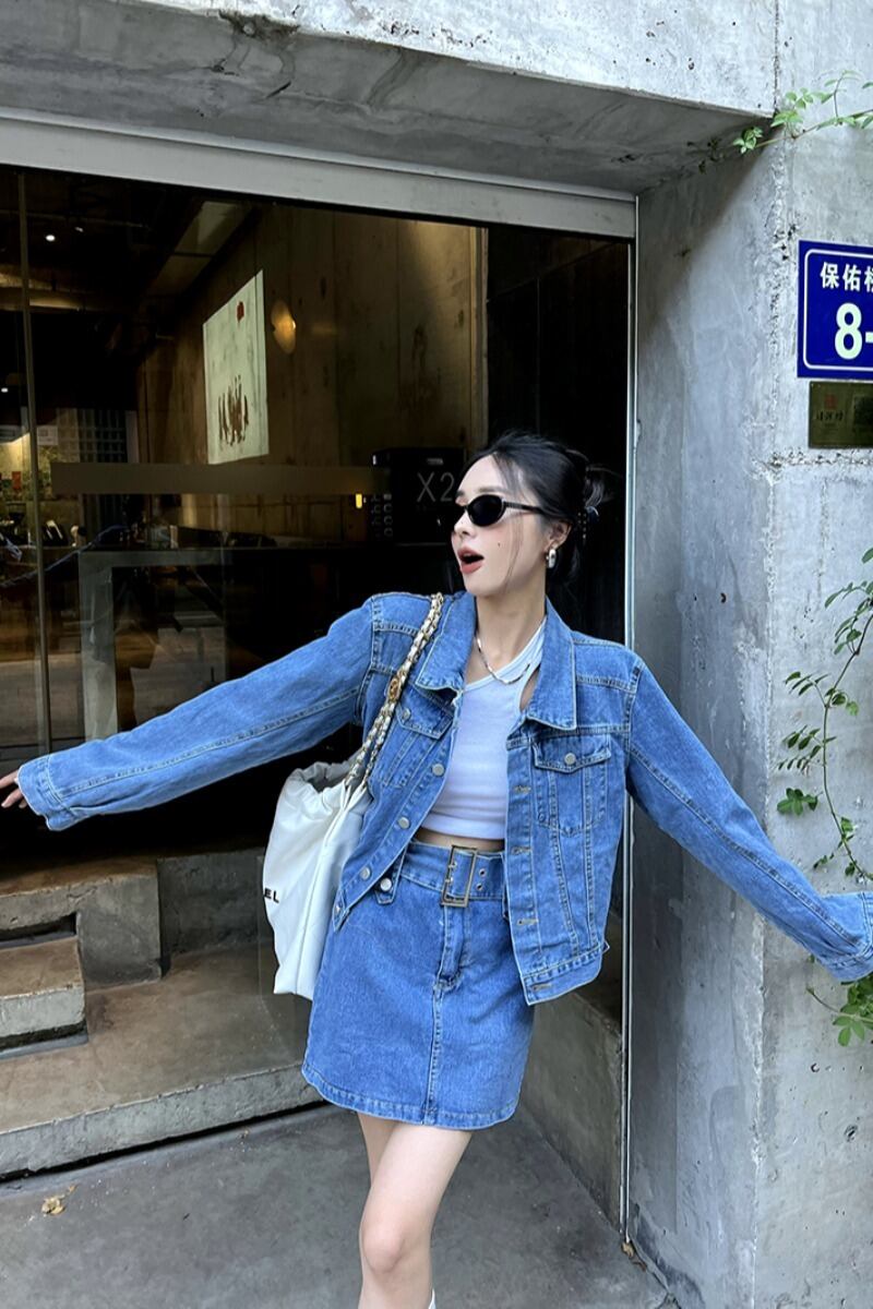 レトロアメリカンデニムスーツレディース春ポロ襟長袖コートウエストAラインスカート2点セット ロング スプリング 春物