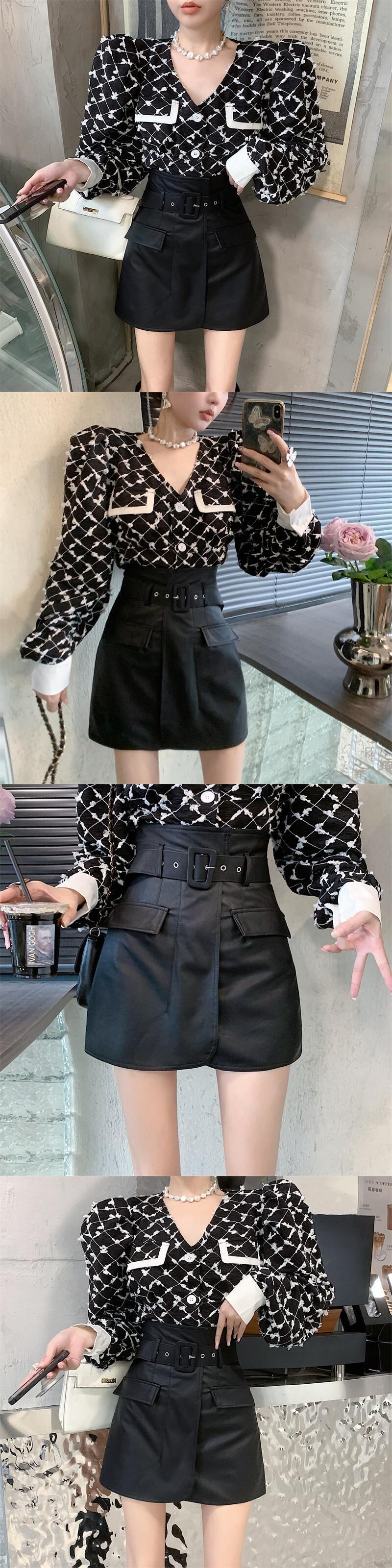 通勤スーツ バブルスリーブ 立体フラワーシャツ レディース 長袖シャツ Aライン スリム PUレザー スカート 2点セット ロング フラワーデザイン