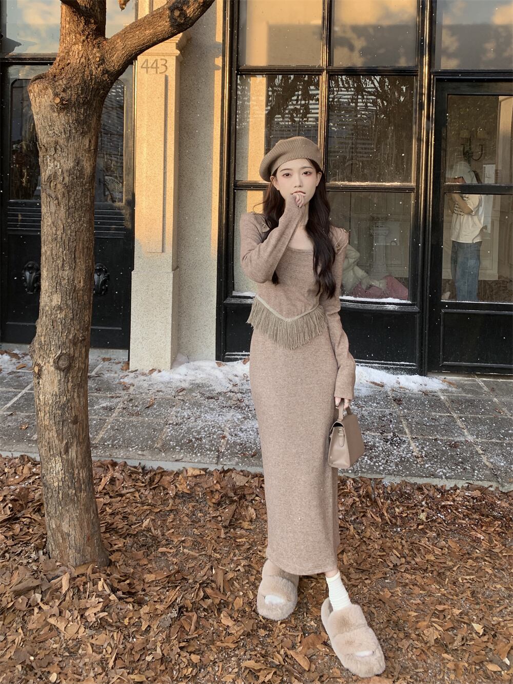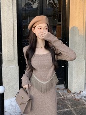 スウィート ガール スーツの秋スクエア カラー電話長袖ニット ウエスト スカート 2 点セット服 ロング 大人ガーリー キュート カジュアル オータム 秋物 スクウェア