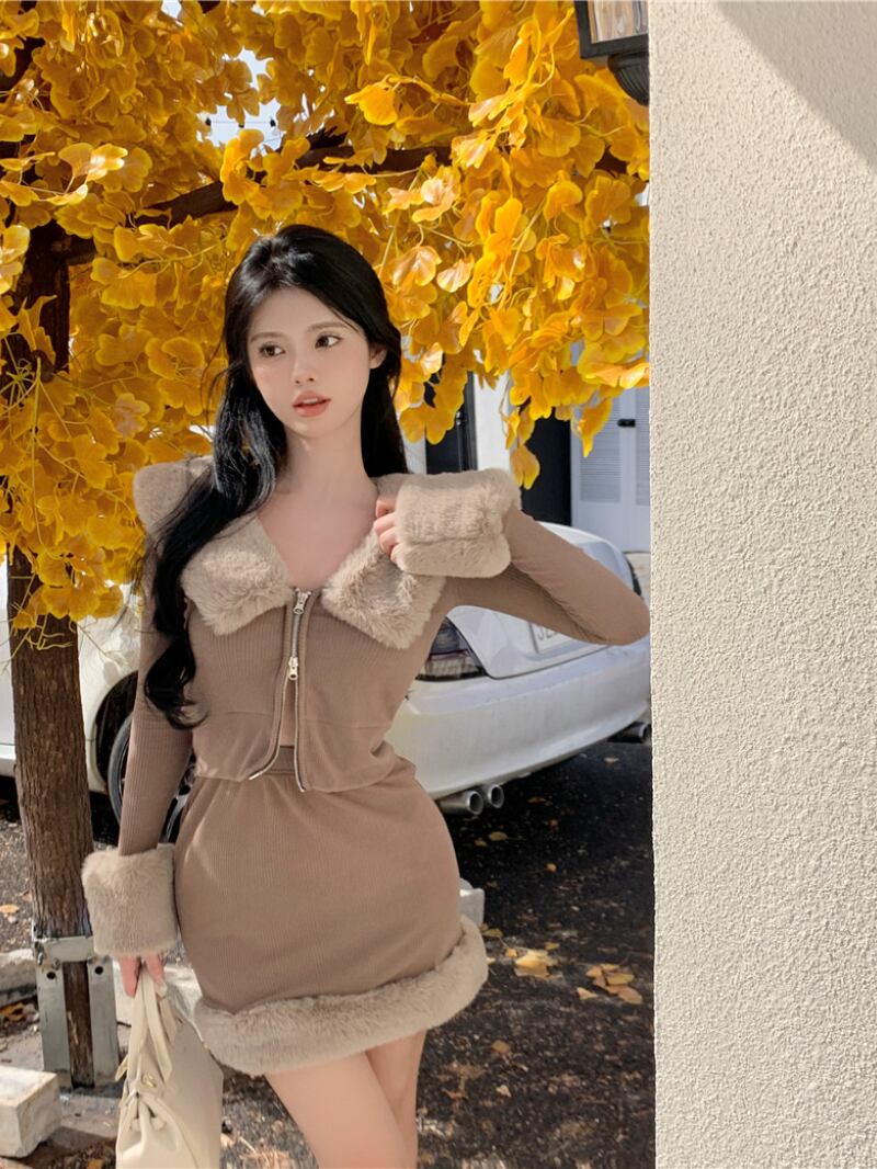 Cl 冬のスーツのの甘いクールなウールスプライシングセーターカーディガンヒップラップスカート 2 点セット服 大人ガーリー スウィート キュート カジュアル ウィンター 冬物