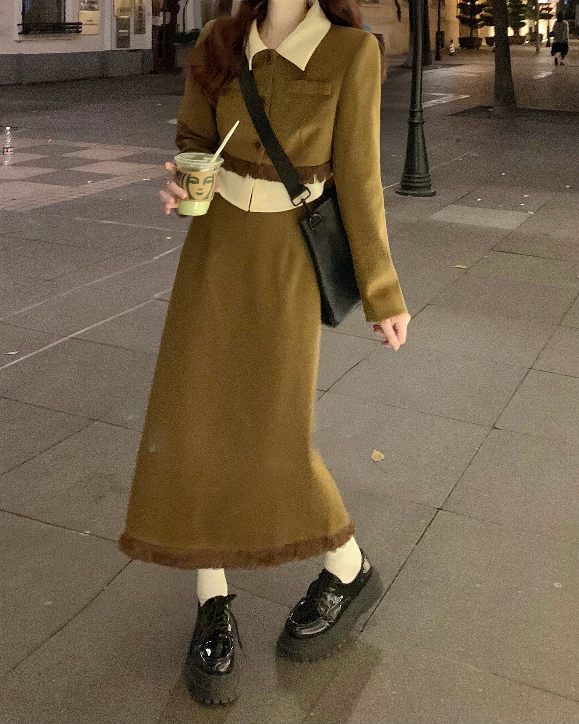スーツ レディース 秋冬スタイル 長袖 ターンダウンカラー コート ウエストスカート 2点セット ロング オータム 秋物 ウィンター 冬物