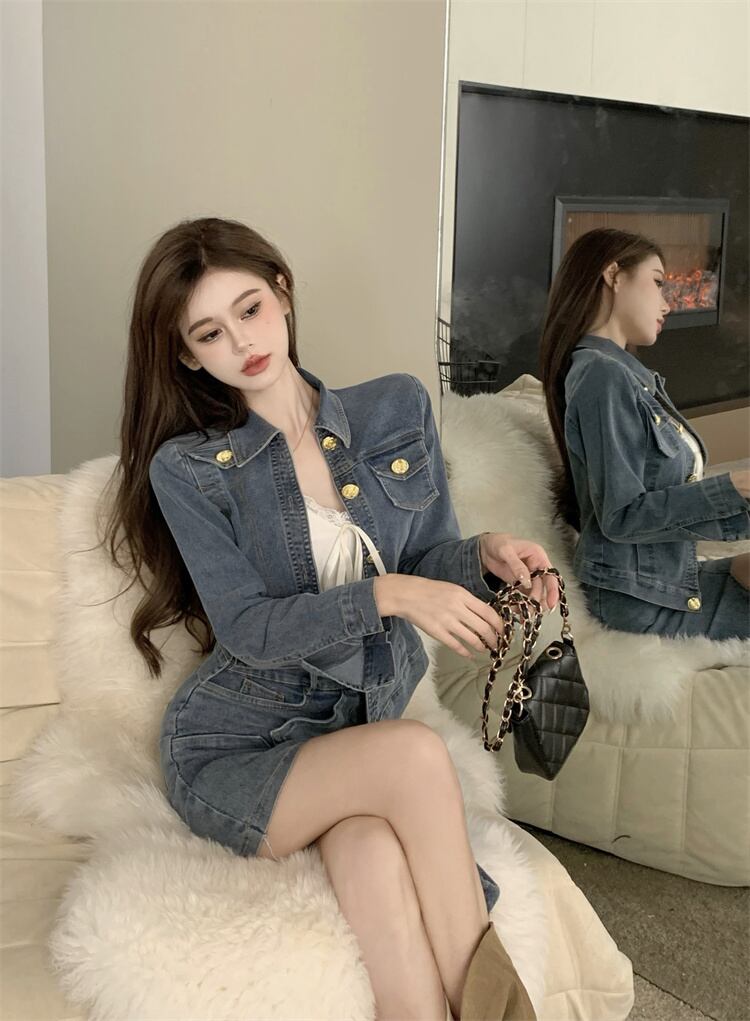 ホットガールデニムスーツの不規則なシングルブレストショートコートウエストヒップラップスカートツーピースセット服