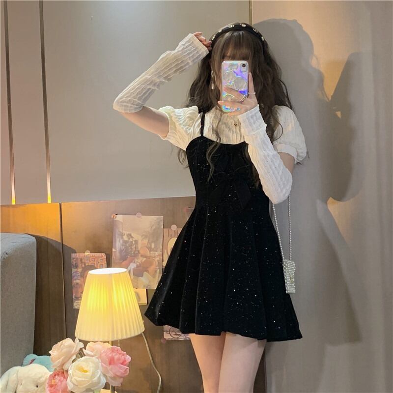 スウィートガールクリスマススーツちょう結びバブルスリーブ底入れニットウェアサスペンダースカート 2 点セット服 リボン 大人ガーリー キュート カジュアル