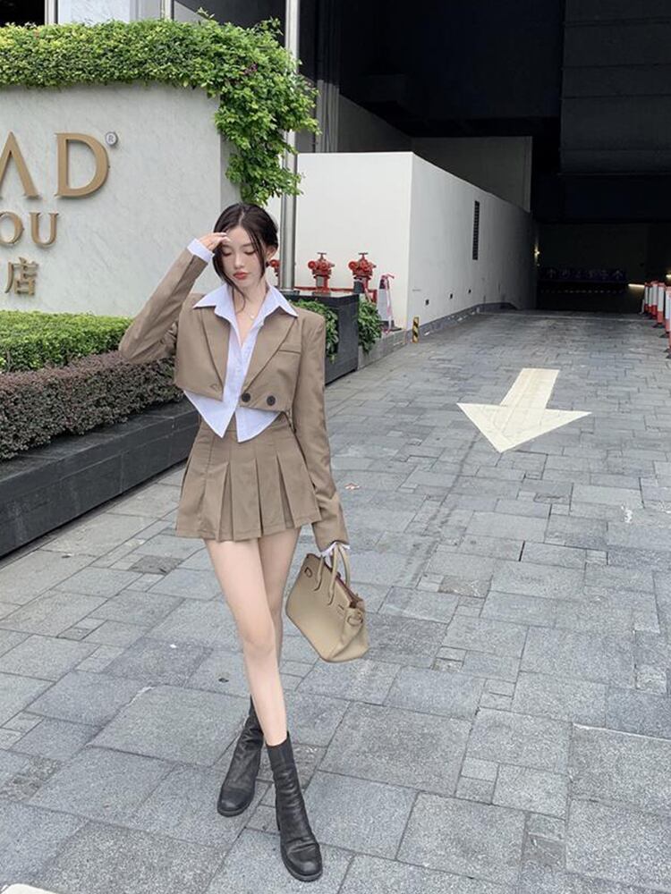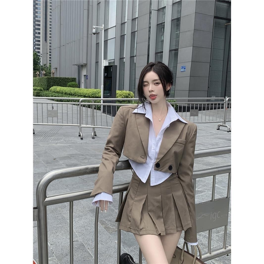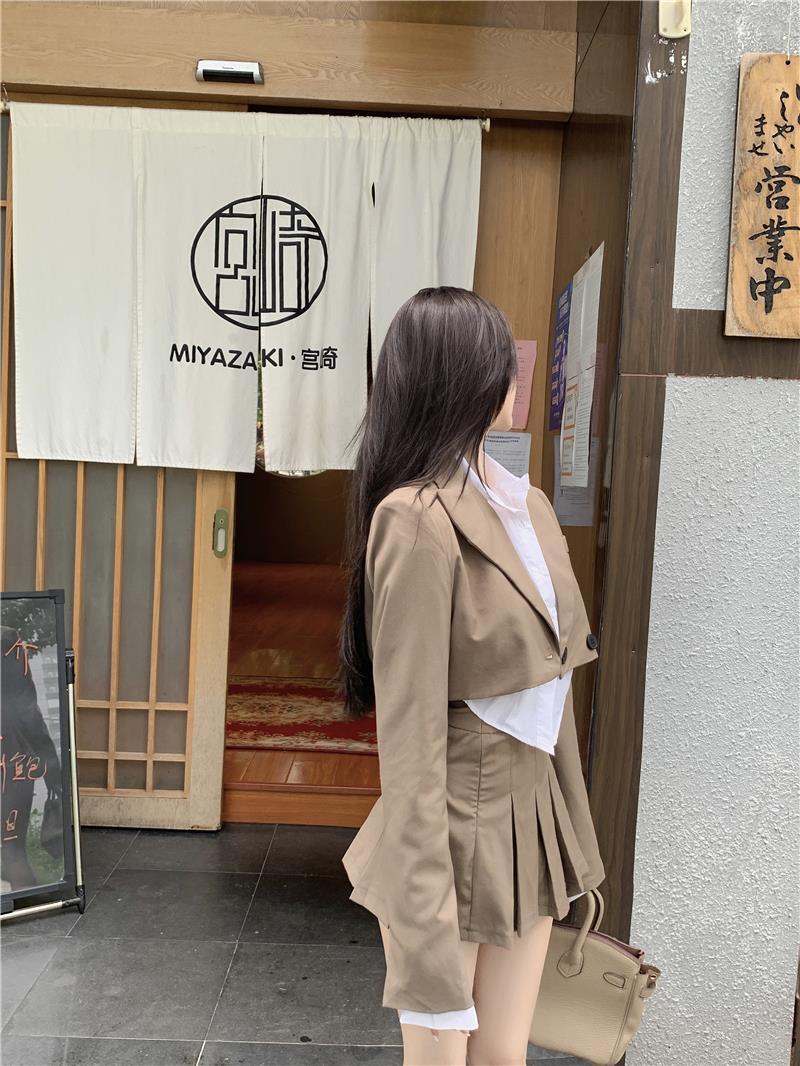 スーツクロップブレザー + シャツ + スカート 3 個カーキセットスキニー布無地オフィスレディ学生スーツ春 スプリング 春物 ソリッドカラー 会社 学校 通勤や通学にも