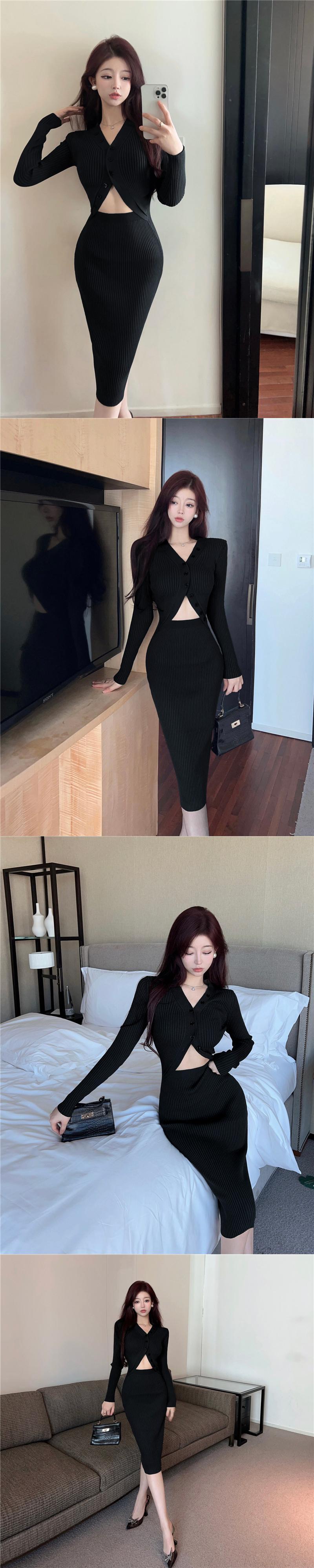 フェイクツーピース V ネック中空ラップ臀部ニットドレスの無地ホットガールスリム底スカート服 Vネック ソリッドカラー