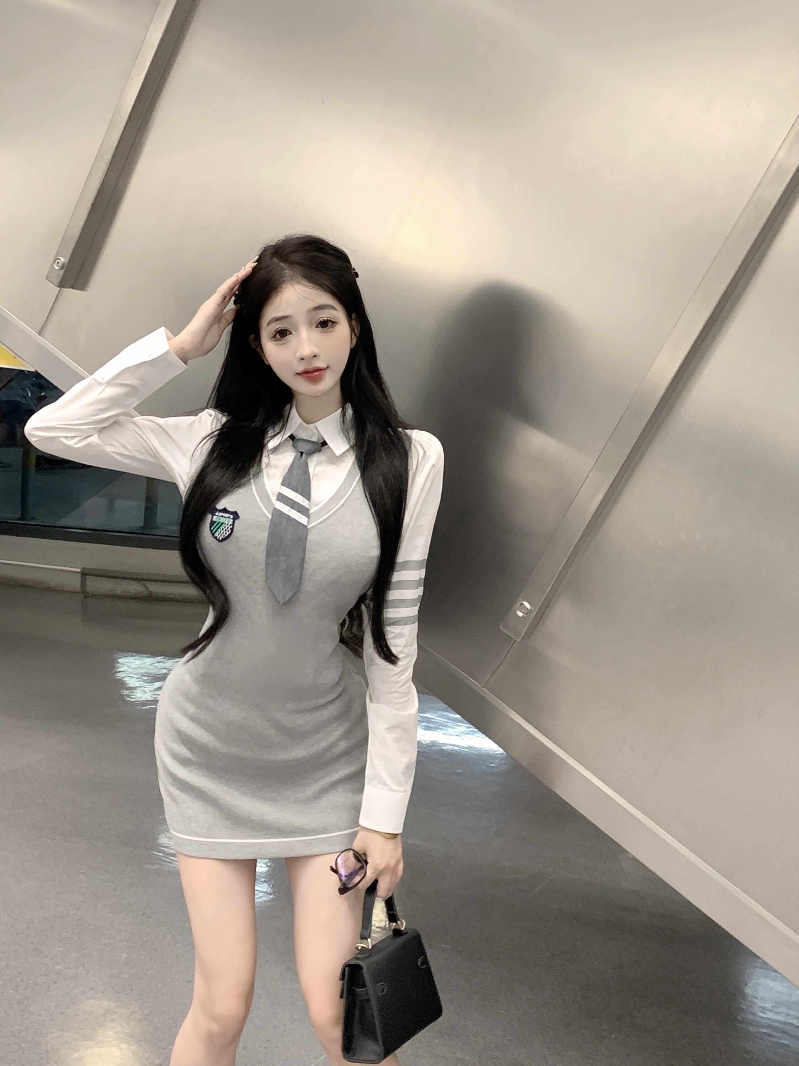 スウィート ガール スタイル スーツのコントラスト V ネック ニット尻ベスト スカート長袖白シャツ 2 点セット ロング ホワイト 大人ガーリー キュート カジュアル Vネック