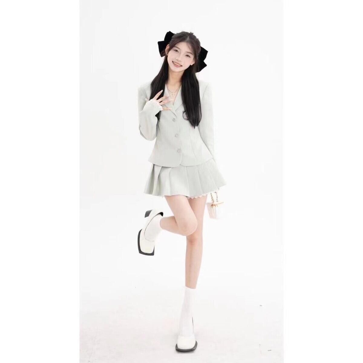 スタイルスーツ レディース 春 ライトブルー 長袖 ショートコート ウエストAライン プリーツスカート 2点セット ロング スプリング 春物