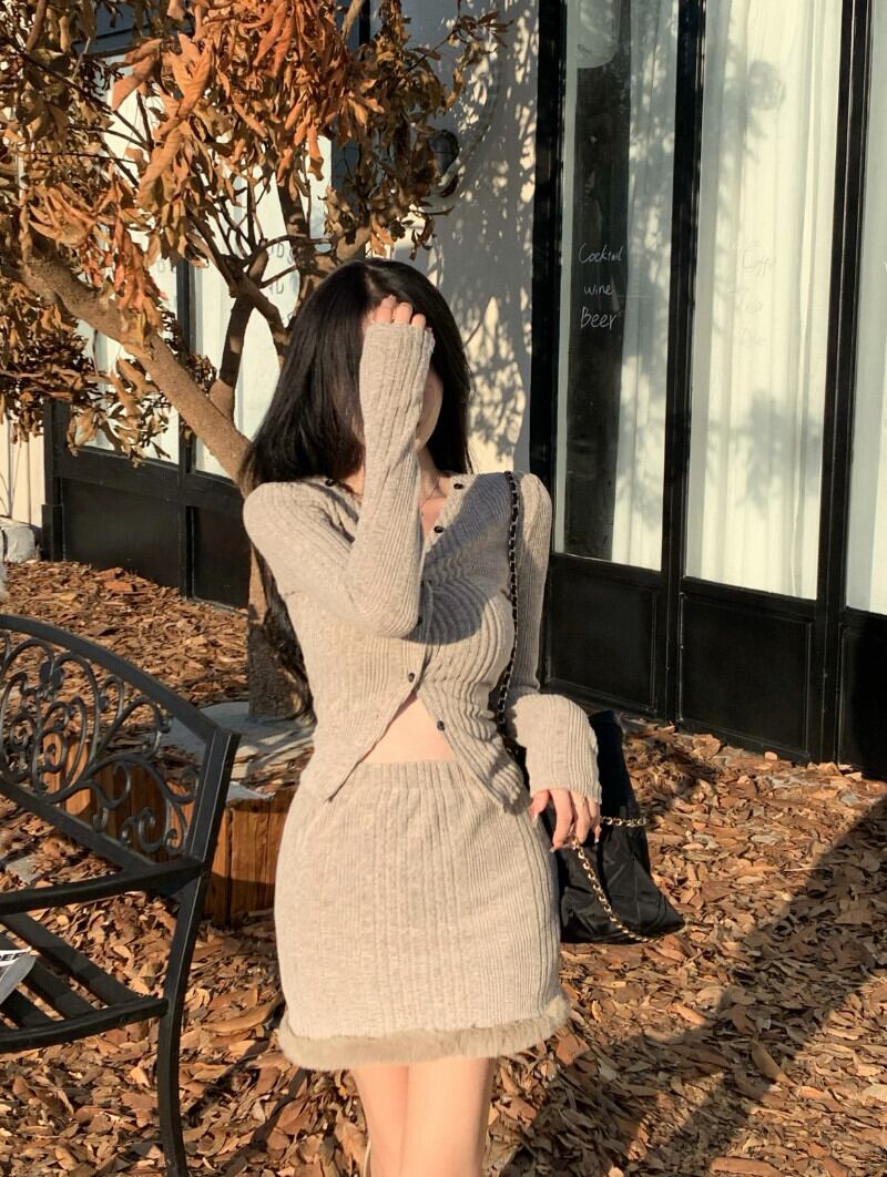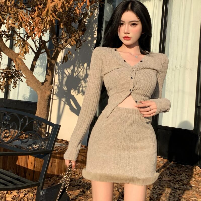 スイートホットガールスタイルスーツの V ネック長袖ボタンニットカーディガントップウエストスリムラップヒップスカート 2 点セット ロング 大人ガーリー スウィート キュート カジュアル Vネック