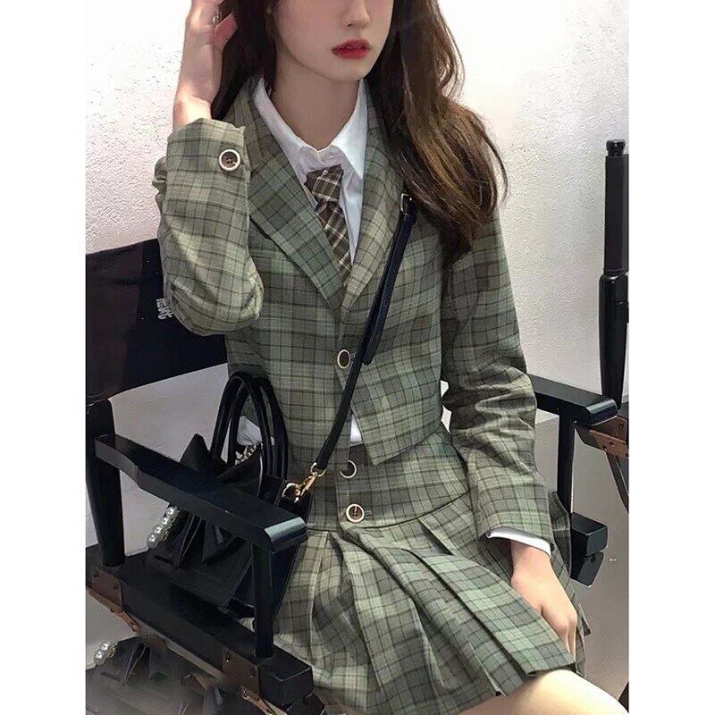 プレッピー チェック柄スカート セット 春 英国スタイル ショート ブレザー ジャケット + プリーツ スカート ツーピース スーツ レディース スプリング 春物