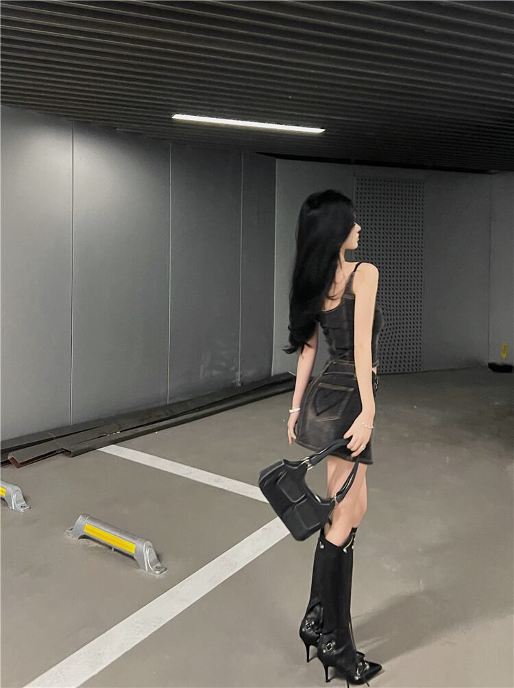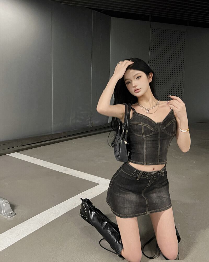 ホットガールズスーツの背中の開いたデニムサスペンダーベスト夏ウエストスリムミニスカートツーピースセット服 サマー 夏物