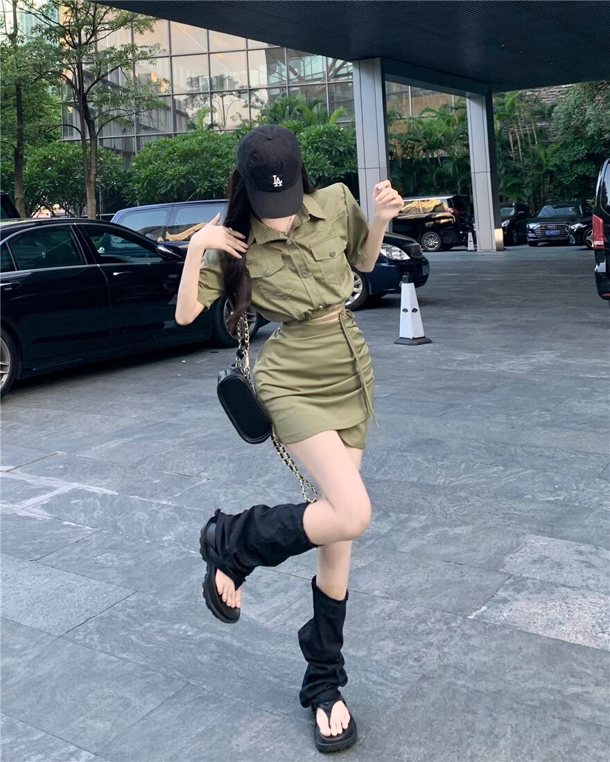 ホットガールスーツの半袖ターンダウン襟ネクタイシャツ-ウエストスリムスカートツーピースセット服