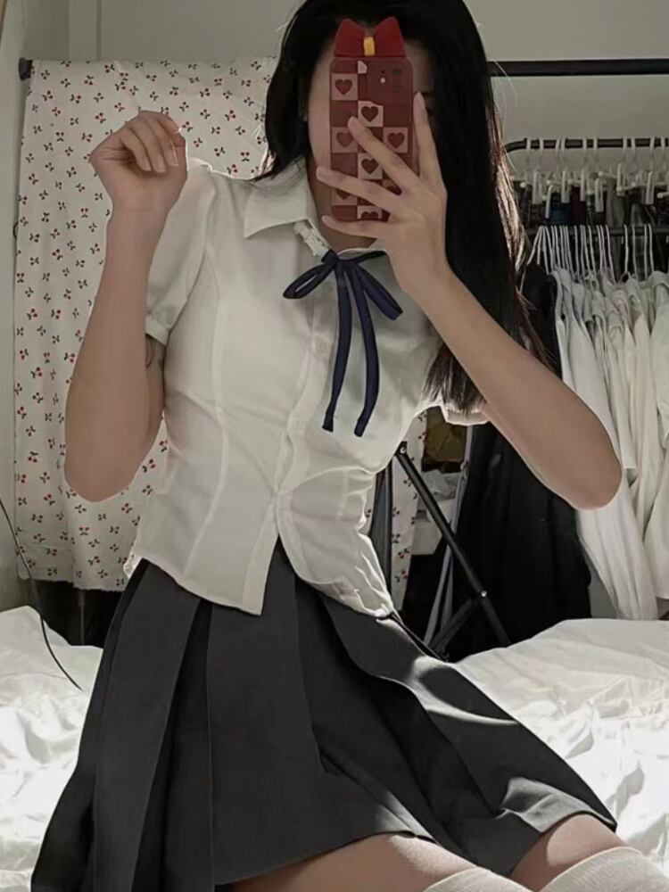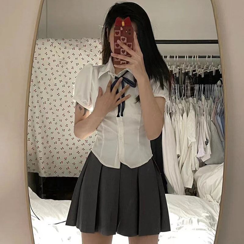 Gothiscyn スーツ白シャツ + プリーツスカート 2 点セット夏春スキニーウエストセクシーなスカートプレッピースーツ A ラインスカート ホワイト スプリング 春物 サマー 夏物 Aライン