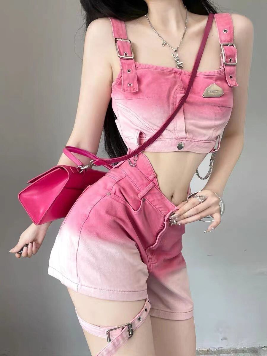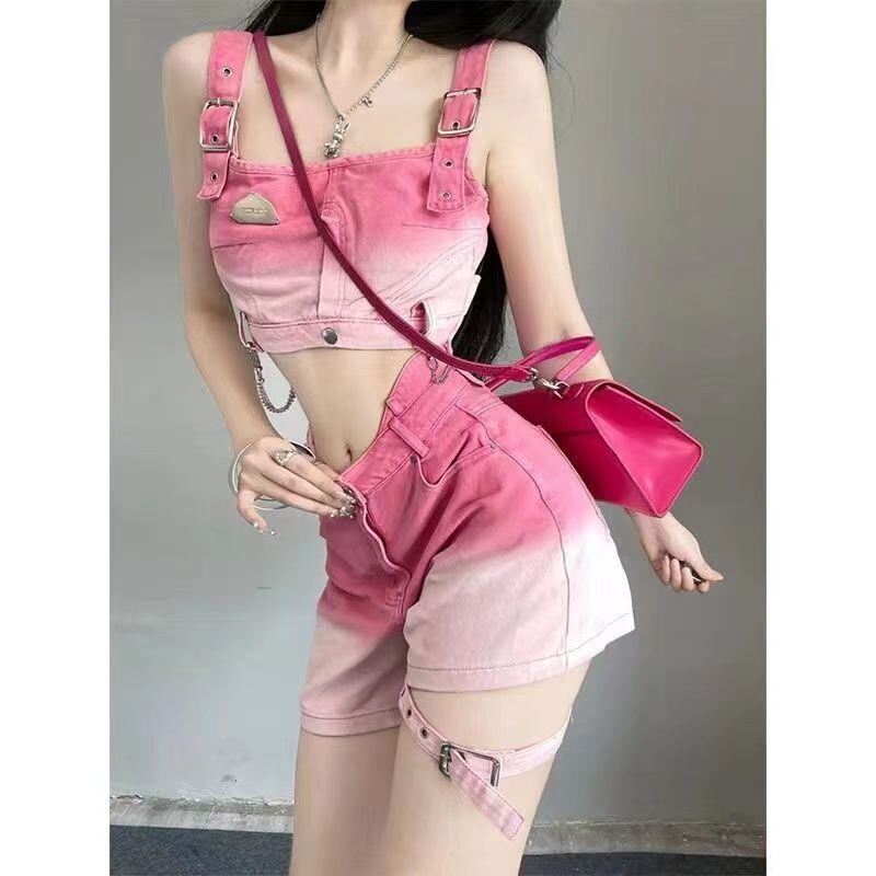 Sweet-cool ホットガールズスーツの夏のグラデーションデニムタンクトップウエストスリムストレートショートパンツ 2 点セット 大人ガーリー スウィート キュート カジュアル サマー 夏物