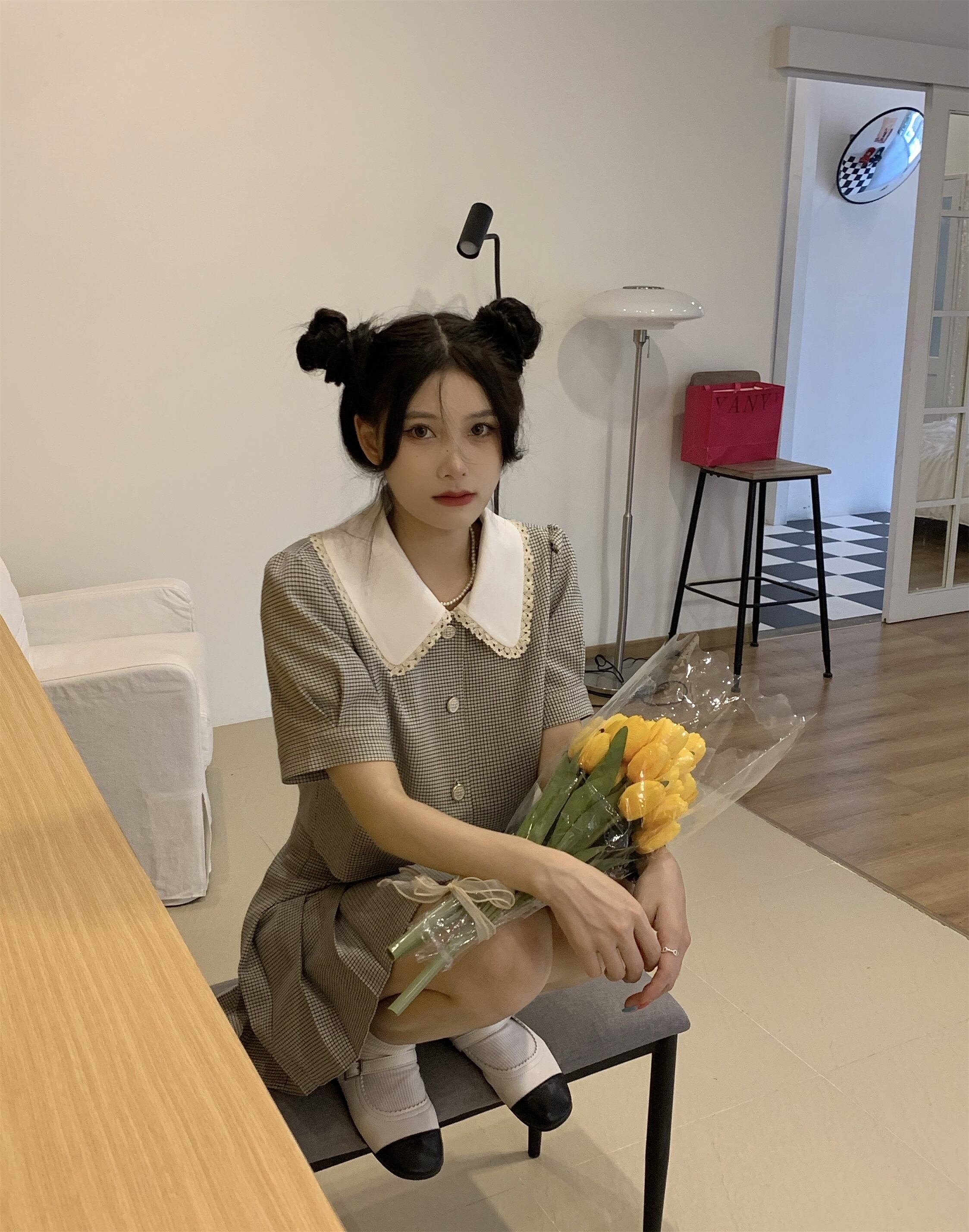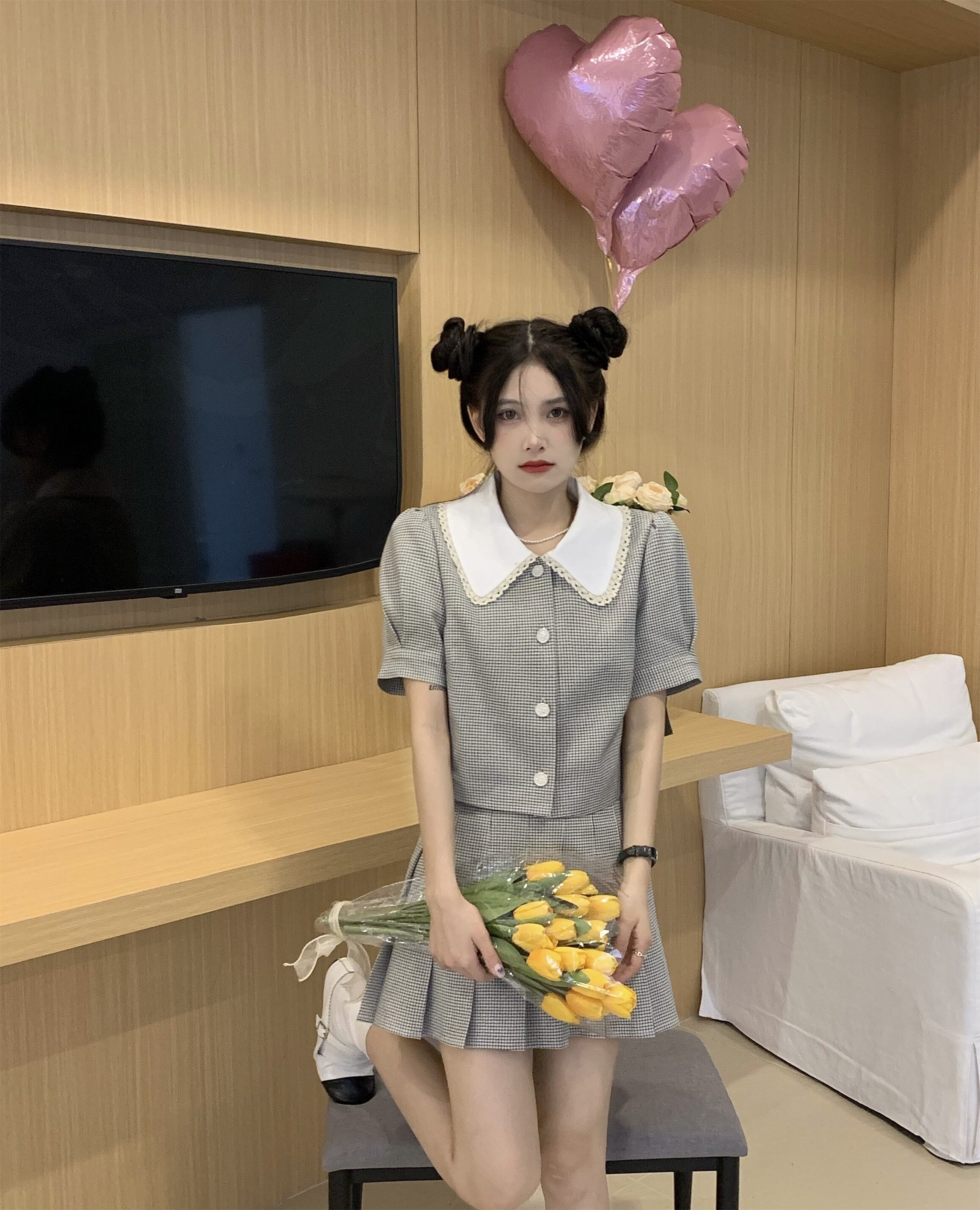 スウィートガールスーツレディーススタイル半袖チェック柄ピーターパンカラートップウエストプリーツスカート2点セット 大人ガーリー キュート カジュアル