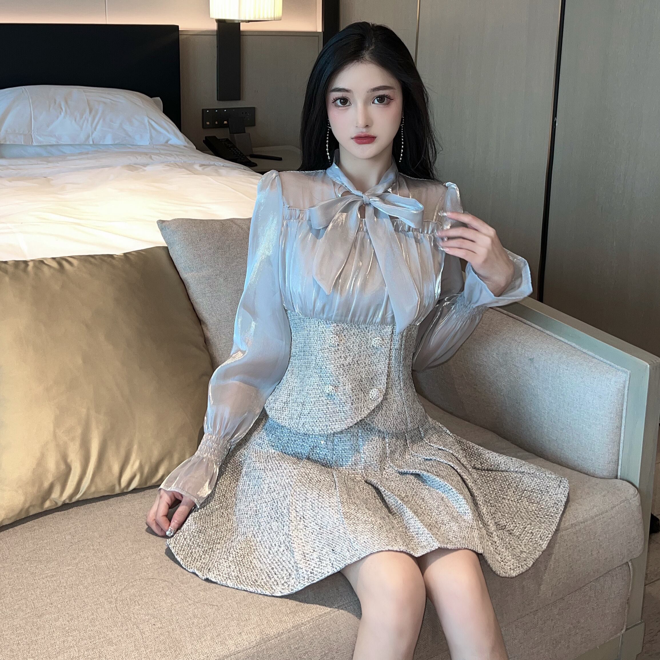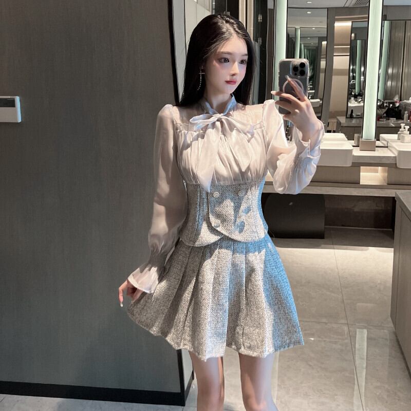 フレンチスタイルバブルスリーブシャツ甘いスプライシング長袖トップウエストプリーツスカートツーピースセット服 ロング 大人ガーリー スウィート キュート カジュアル