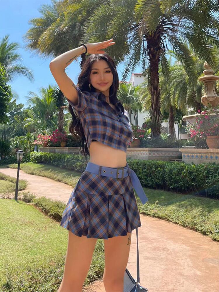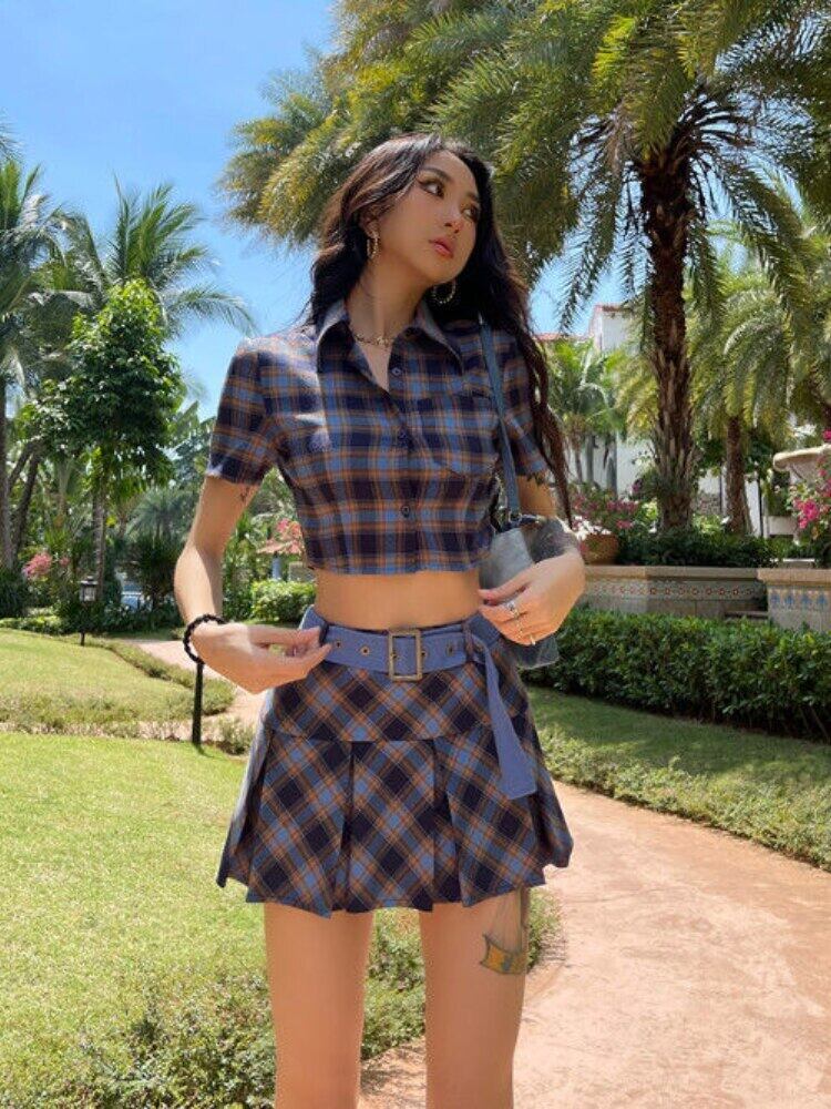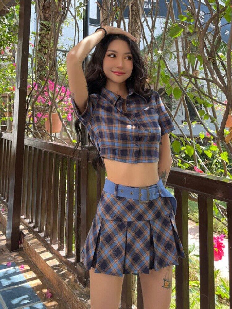 ストリートチェック柄クロップトップシャツチェック柄ブルーシャツ + ミニスカートスキニーセクシーな 2 点セットスーツショート服夏 サマー 夏物