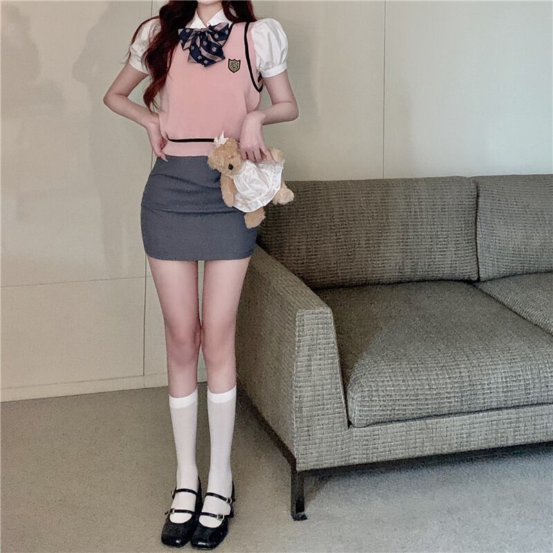 Gothiscyn 3 点セット レディース衣装 V ネック ベスト ショート ニット トップ ミニ スカート無地チョッキ梨花服夏スカート セット サマー 夏物 Vネック ソリッドカラー