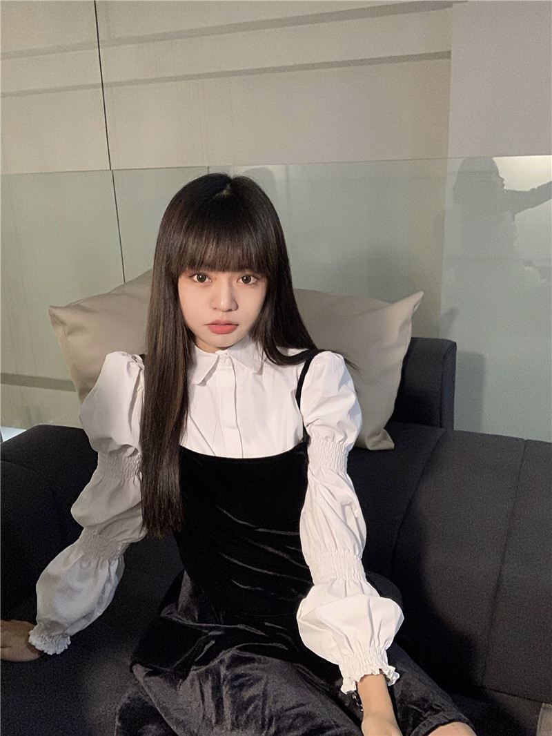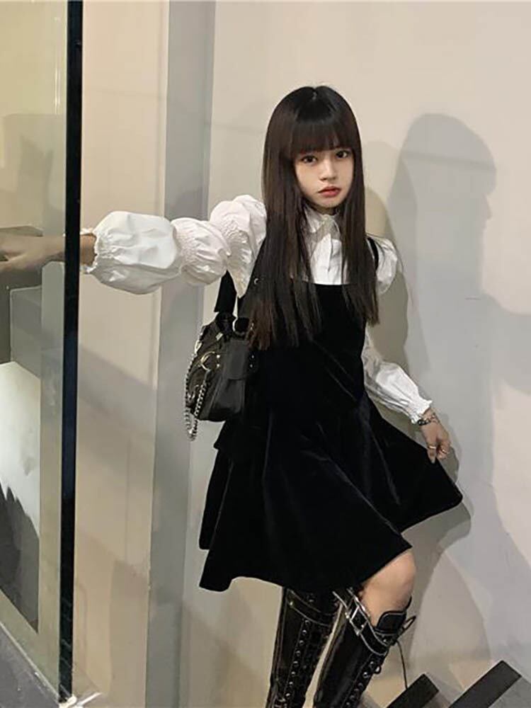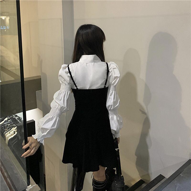 Gothiscyn スカート セット パフ スリーブ ホワイト シャツ ノースリーブ ブラック ドレス ストリート ツー ピース セット Fahion 衣装