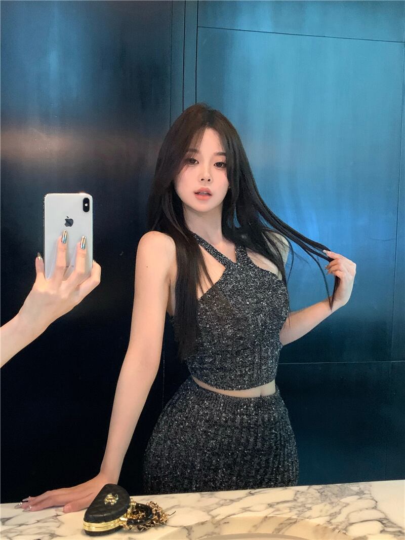 夏ホット女の子スーツのホルター スリム ニット ショート トップ ウエスト ロング スカート ツー ピース セット服 サマー 夏物