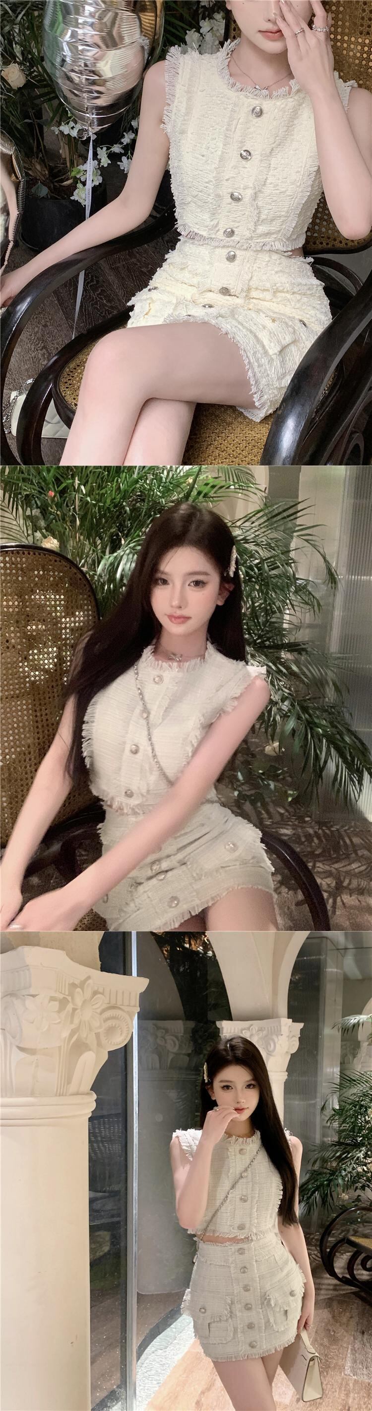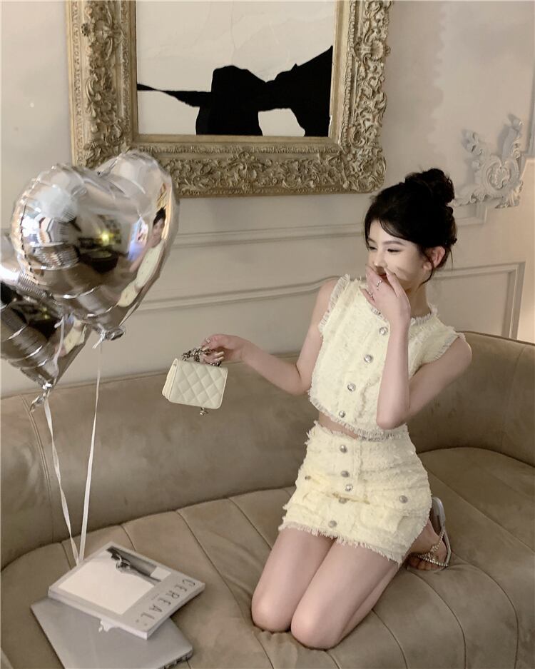 ホットガールスーツの O ネックサスペンダーベストショートトップ夏ラップヒップミニスカート 2 点セット服 サマー 夏物 Oネック