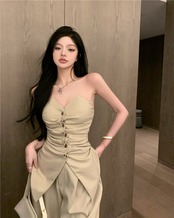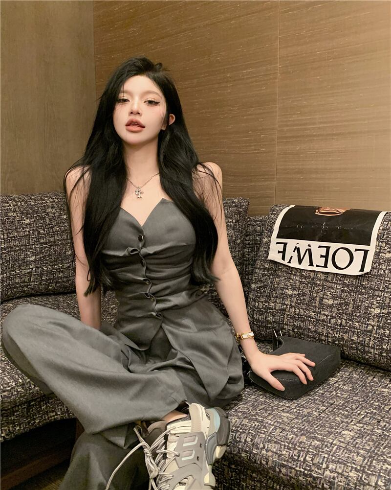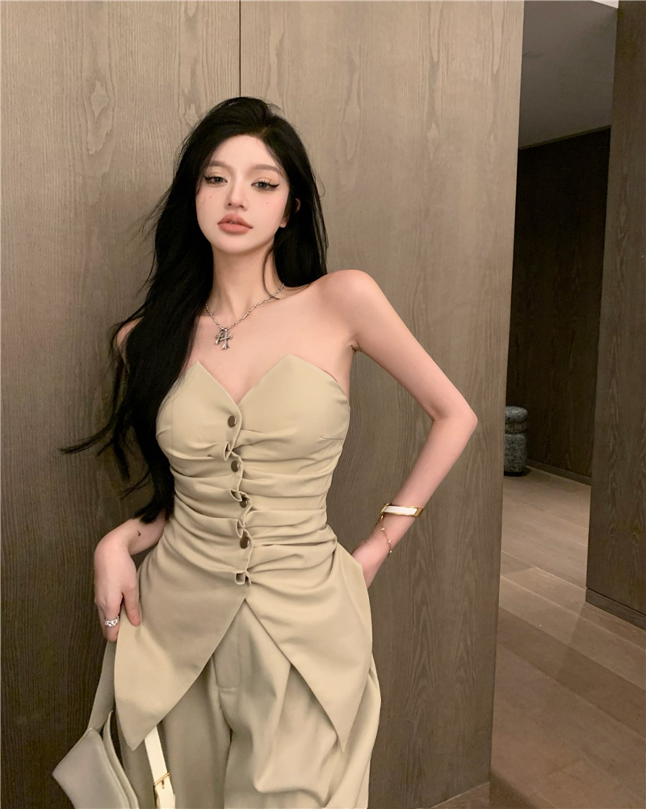 ヨーロッパ系アメリカ人オフィスレディスーツのしわストラップレストップウエストワイドレッグパンツツーピースセット ワイドパンツ ヨーロピアン 会社 学校 通勤や通学にも