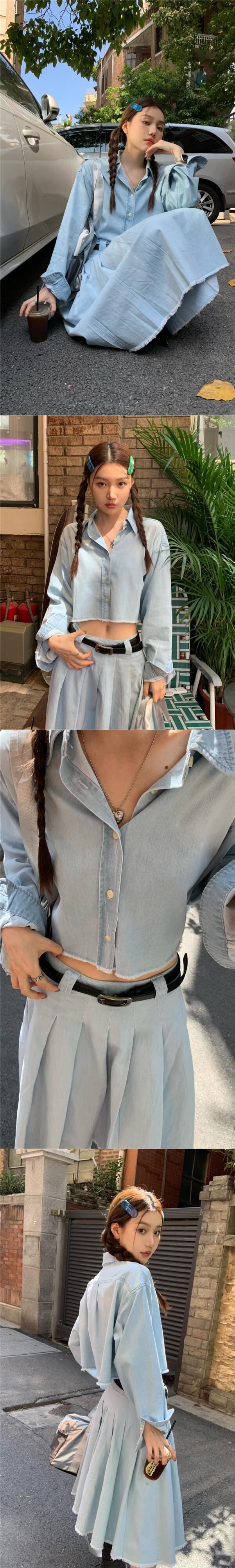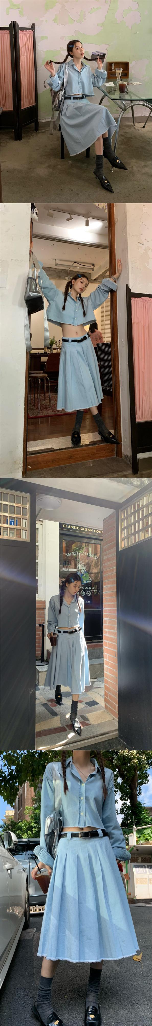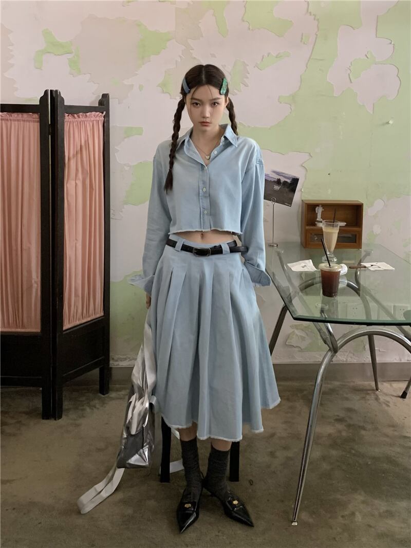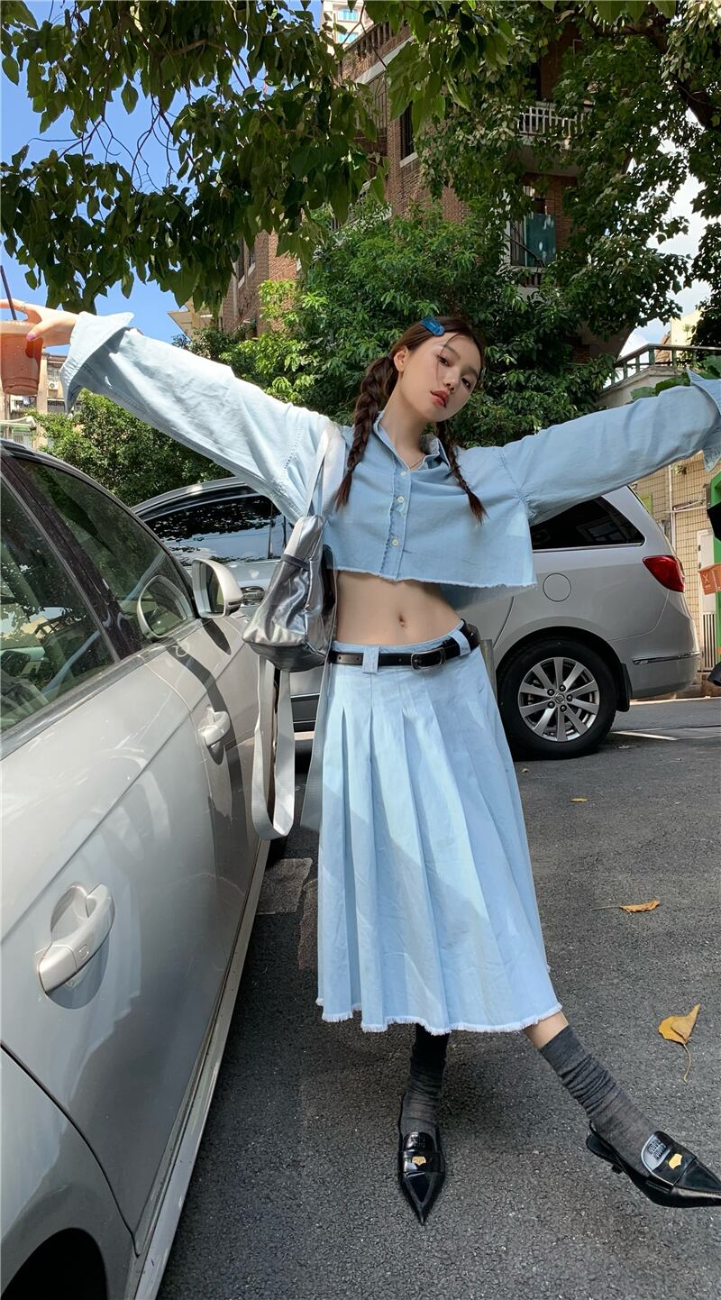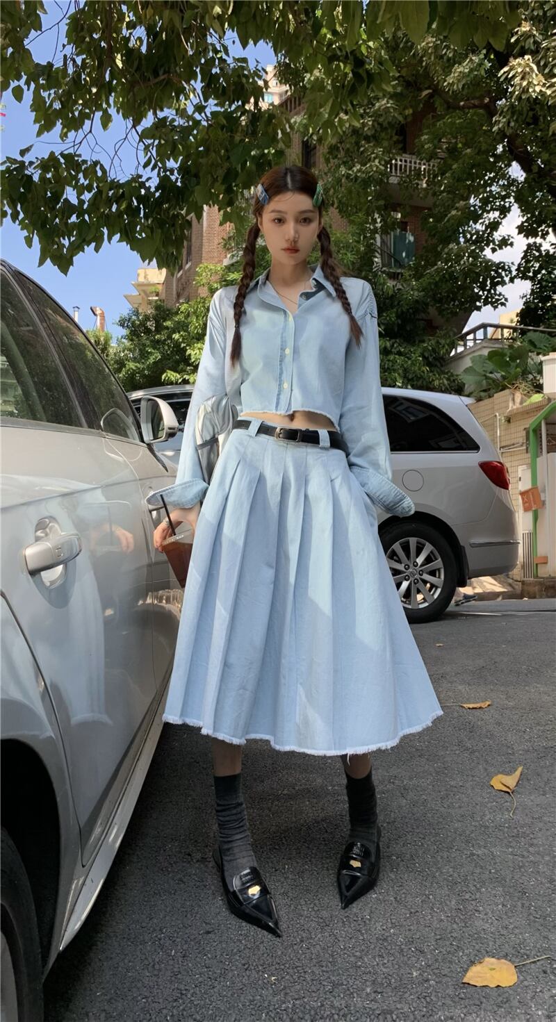 ツーピースセットレディース衣装甘いデニムスーツショートシャツトップスプリーツスカート梨花服秋スカートセット 大人ガーリー スウィート キュート カジュアル オータム 秋物 ソリッドカラー