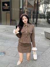 スウィートガールスーツの秋冬フレンチスタイルセレブショートコートウエストスカートツーピースセット服 大人ガーリー キュート カジュアル オータム 秋物 ウィンター 冬物