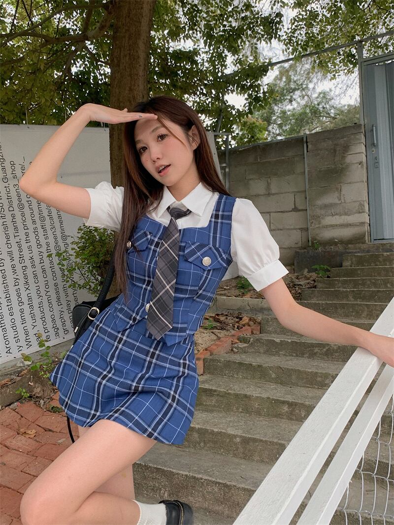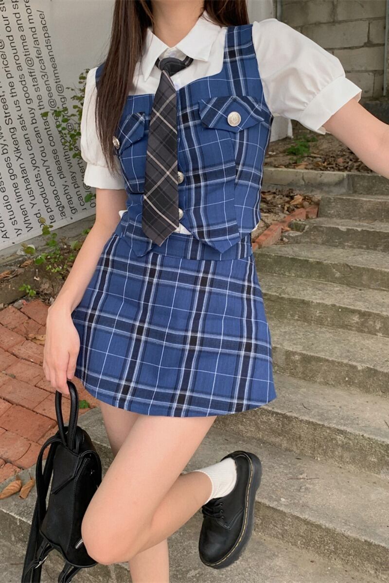 スウィートクールアカデミースタイルスーツレディースチェック柄ベストホワイト半袖シャツウエストスカート3点セット服 大人ガーリー キュート カジュアル